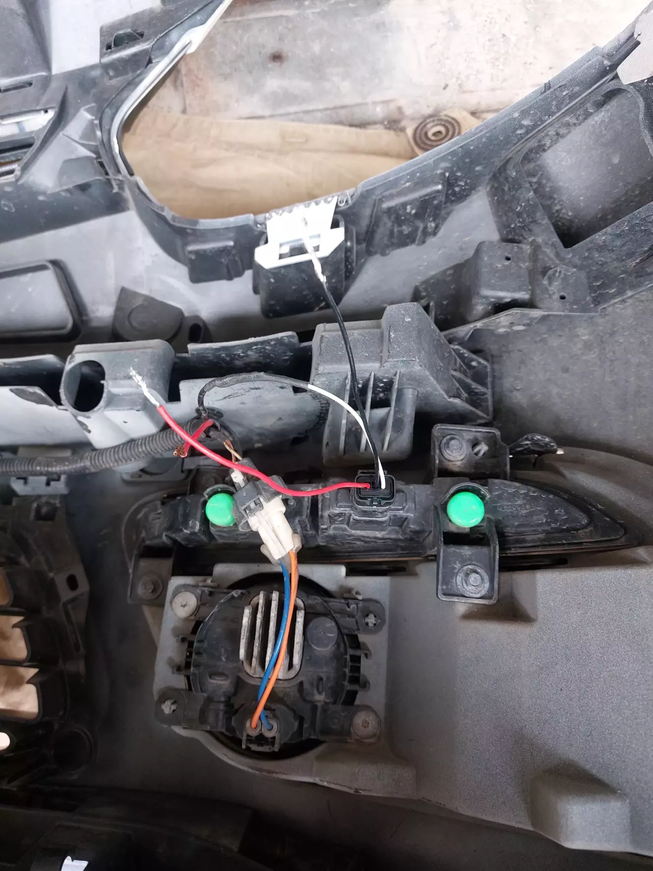 Стосовно самого підключення. Довелося знову зняти бампер, тому що треба перепідключити ДХВ, додати 2 нові дроти саме на контакти 11Т та 11S. Для цього докупив 2 дроти білого та зеленого кольору, це у мене буде плюс лівого та плюс правого ДХВ. Чорний мінусовий дріт у мене вже є, його я навіть не чіпав. Другий червоний дріт також у мене є і це буде плюс від габаритів. Коли зняв бампер і розкрутив дроти і роз'єми додатково перевірив який контакт за що відповідає. З мінусом все було зрозуміло, а от 2 останні плюс на ДХВ були у меня з'єднані в один. Розкрутив і перевірив, що один контакт дає 100% світла, контакт буде йти на блок на роз'єми 11Т та 11S від кожної ДХВ. А другий контакт плюсовий який дає 50% світла я з'єднав їх разом від першої та другої ДХВ так привів також у блок. Спочатку я все скомутував на бампері.