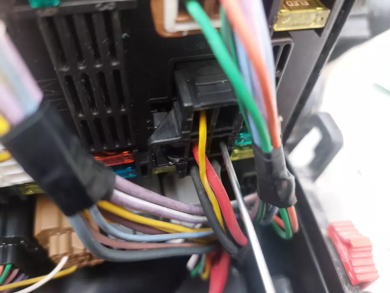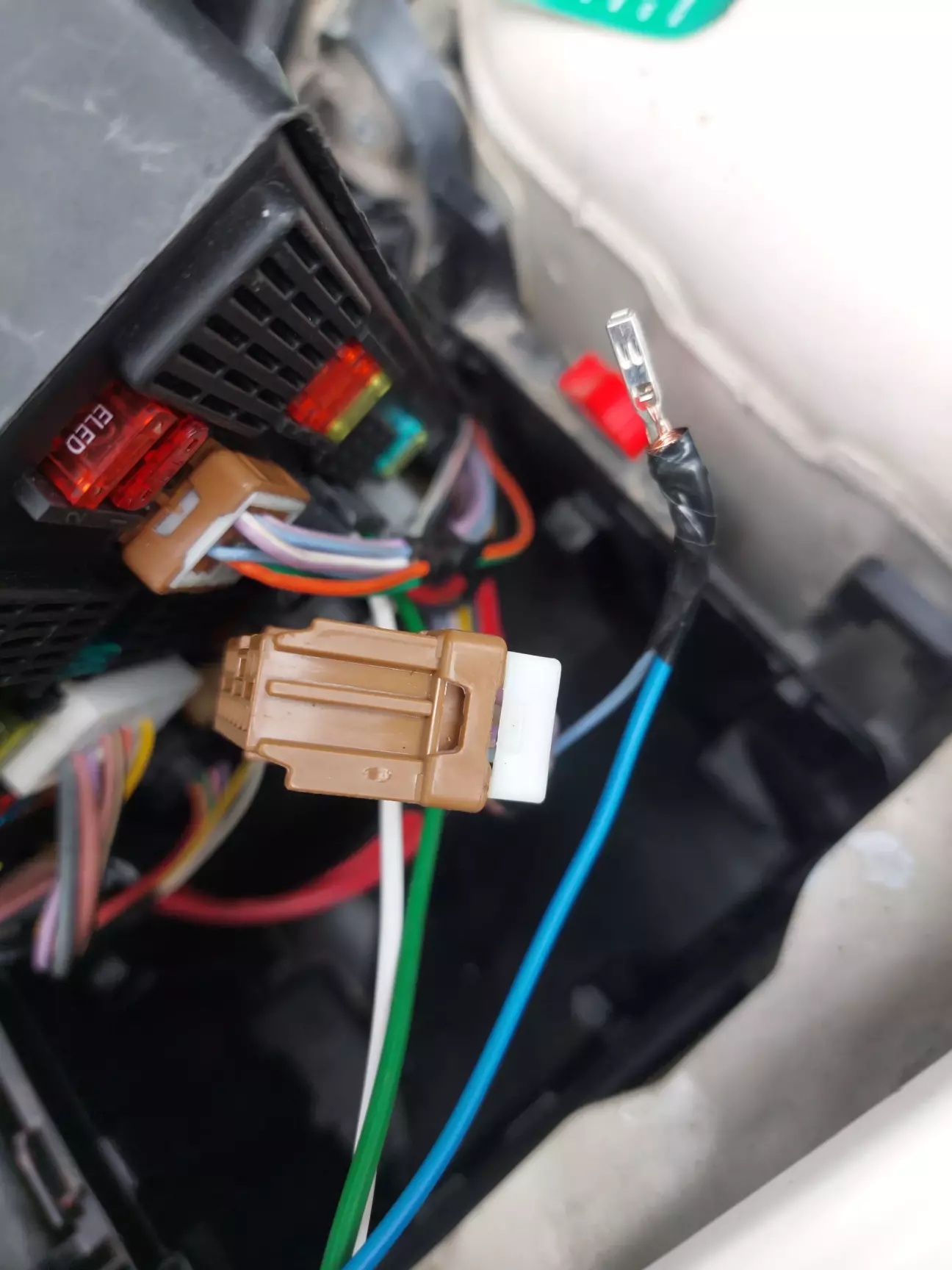 В цьому ж роз'ємі є ще й 2 мінусові контакти, але мені не вдалося витягти пін з мінусовим дротом з колодки, щоб переобжати на новий пін з додатковим дротом, тому мінусовий від ДХВ у мене як і раніше іде поза блоком одразу на планку на АКБ. Може колись перероблю.