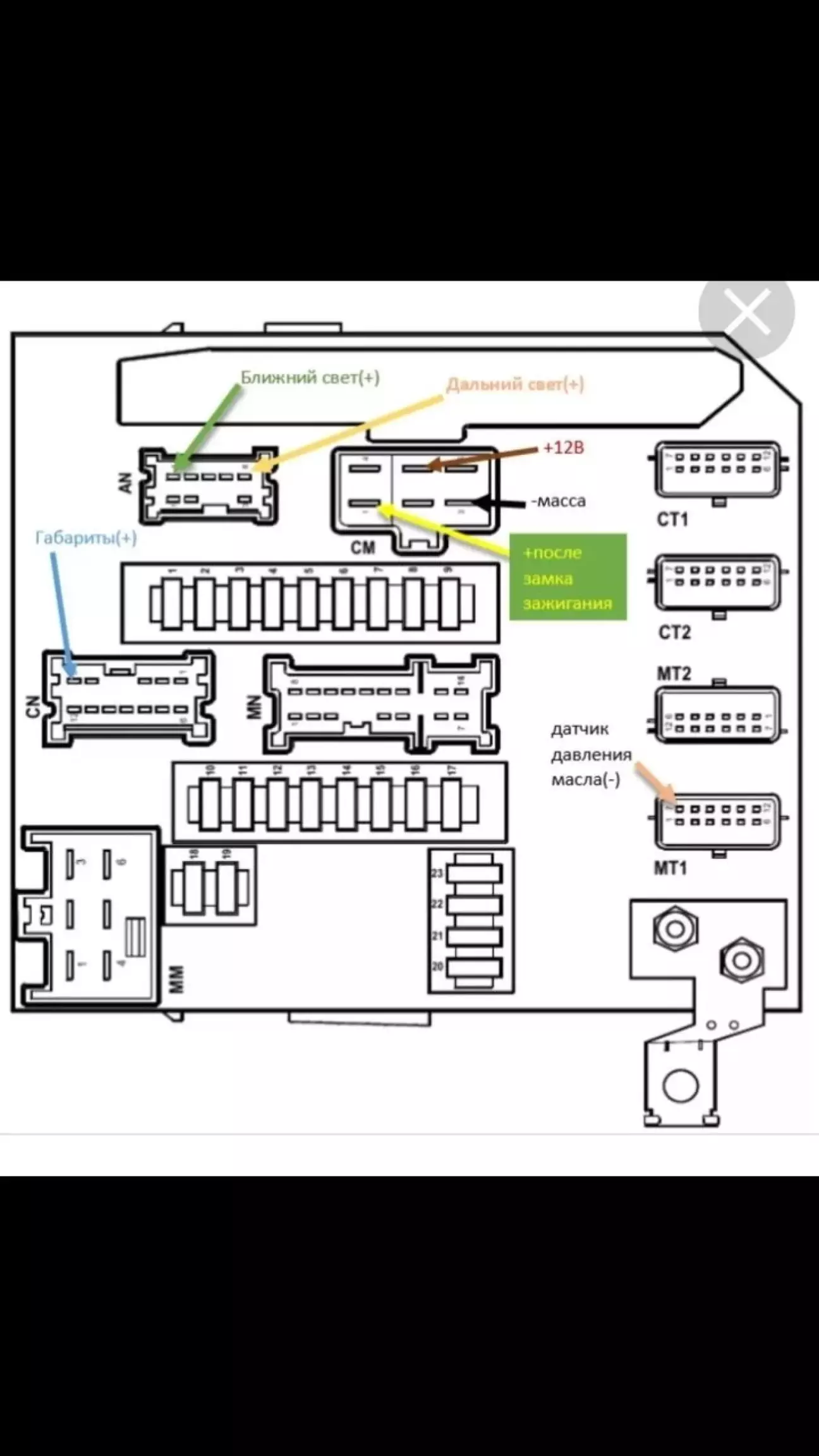 І лишився ще плюс на габарити. Цей плюс я буду брати також в блоці на роз'ємі CN у правому верхньому куті блакитний дріт.