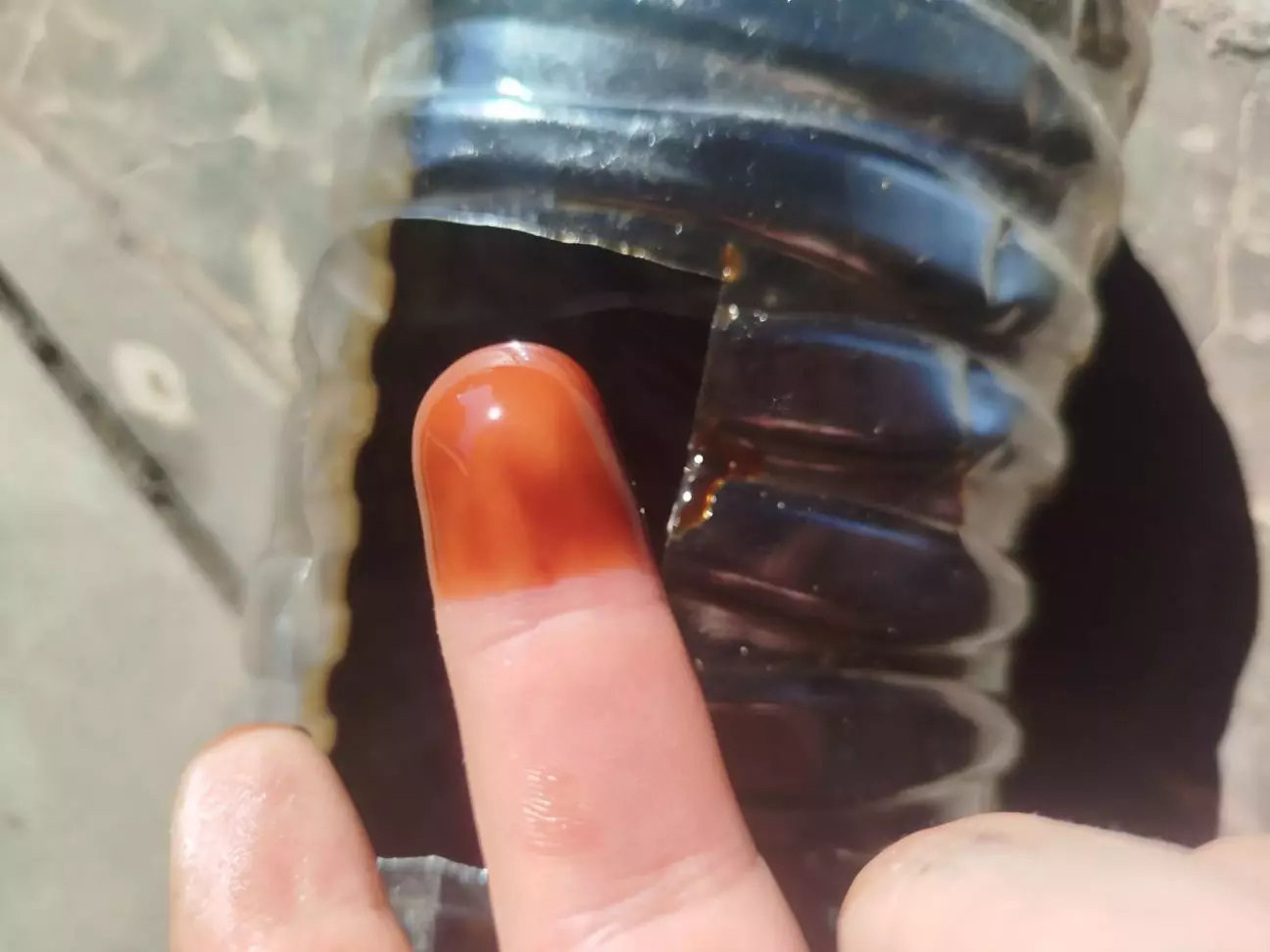 Масло, хоч на фото виглядало відносно світлим, насправді було темніше й мало невеликі згустки — їх добре було видно і на щупі. За допомогу зі знімачем віддячив сусідові паком пива Tuborg з АТБ.