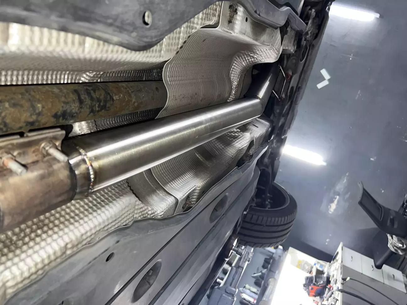 В кінці маємо такий сетап вихлопу: давнпайп без каталізатора - прямоточний резонатор - рідний глушник з заслонками. Звук вийшов прикольний, хоча може даже трохи гучніше ніж я очікував. Треба прикататись.