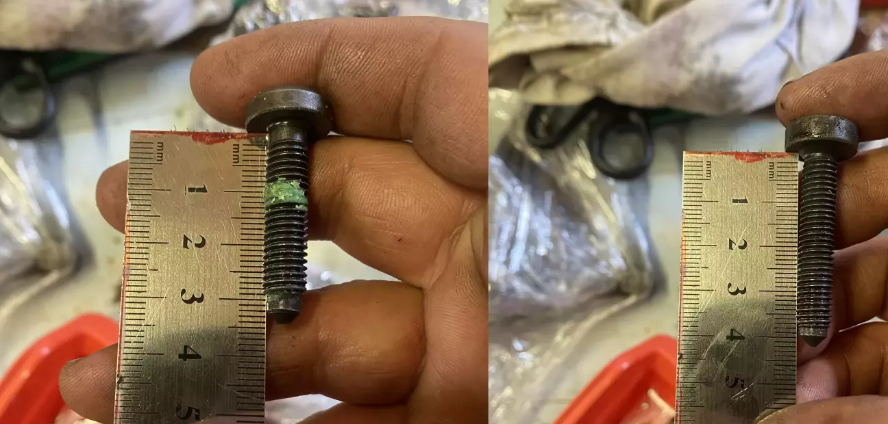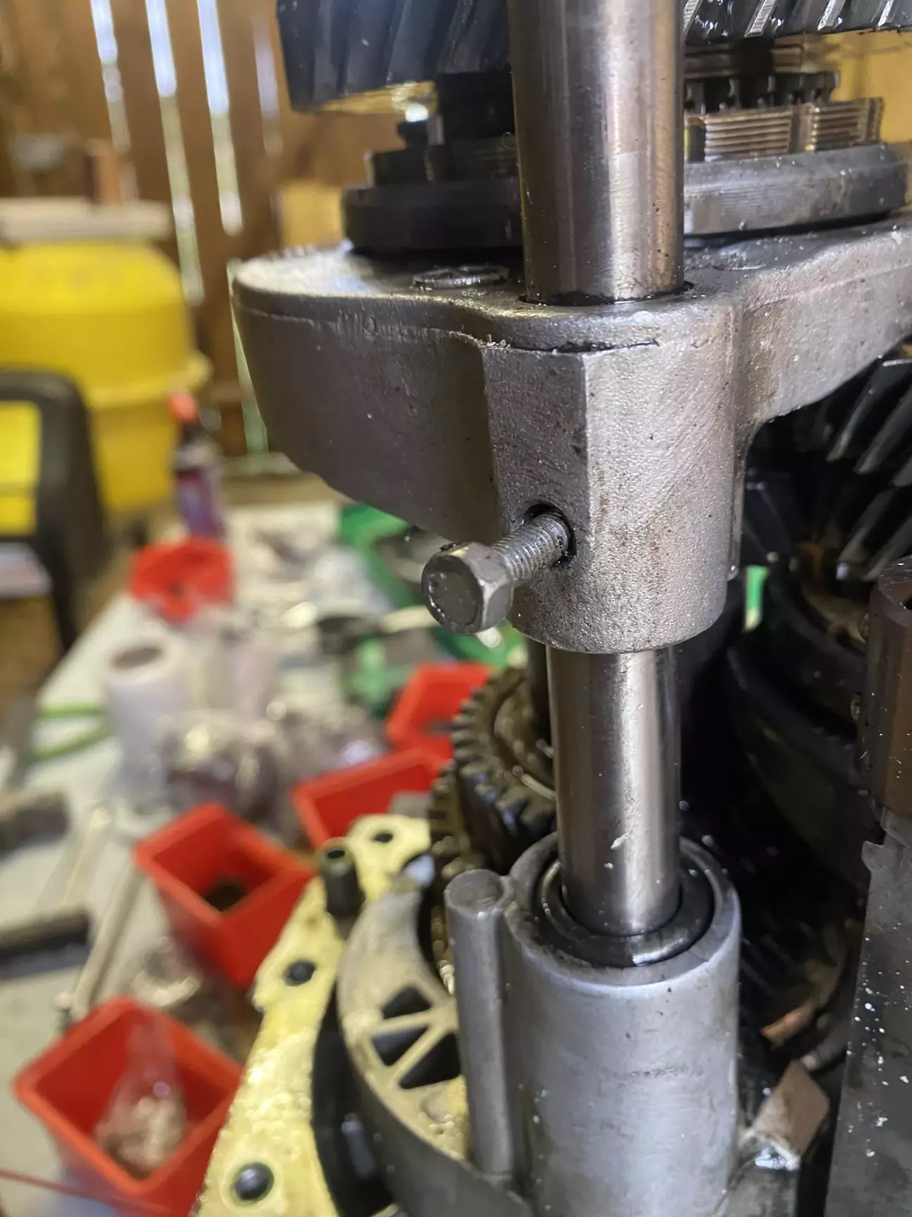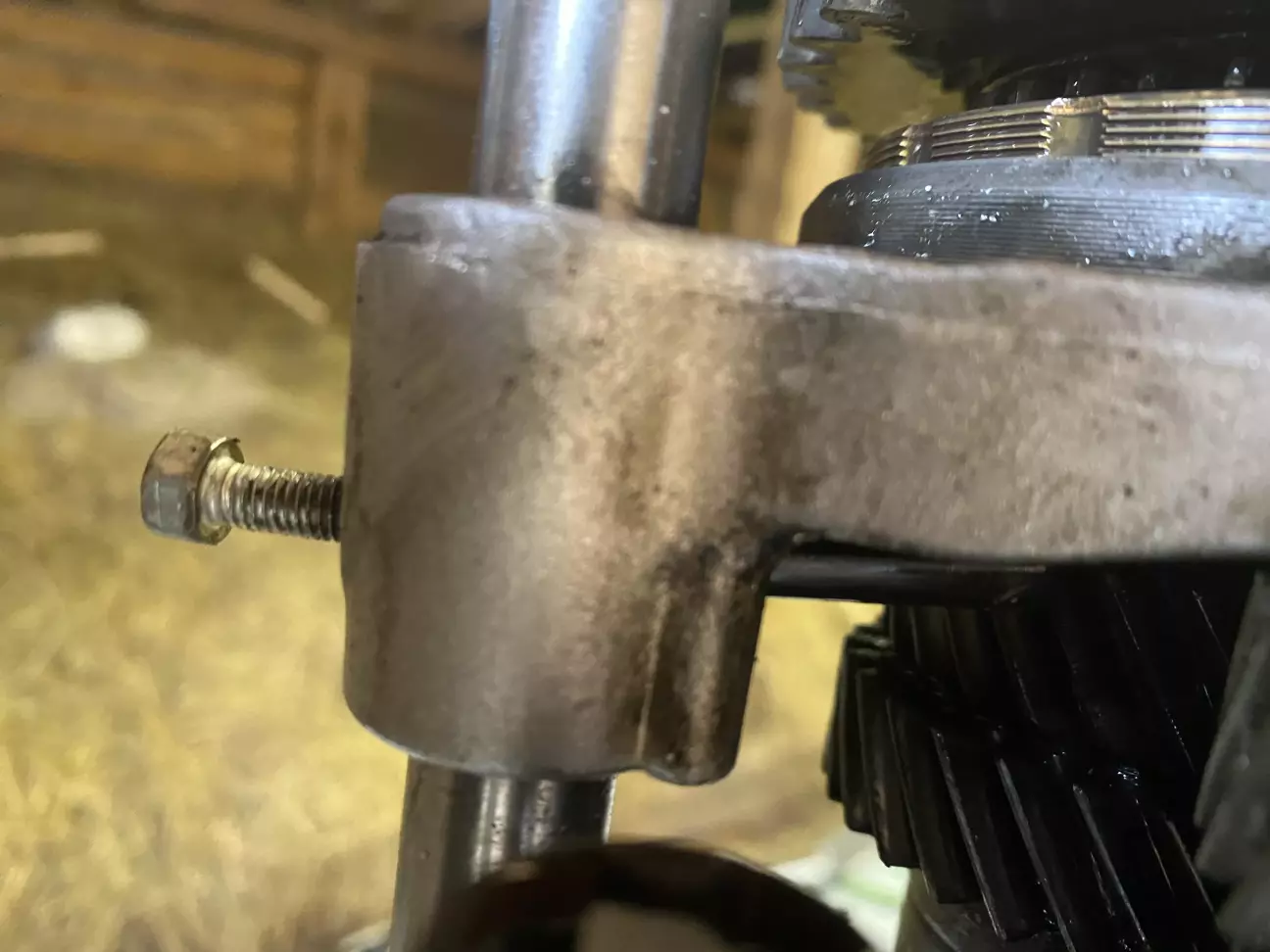 Далі треба випхати штифт вилки передач, болт чи на М5 чи на М6 і легко вибиваємо всередину. Штифт не суцільний а пружинний з смужки металу скручений.