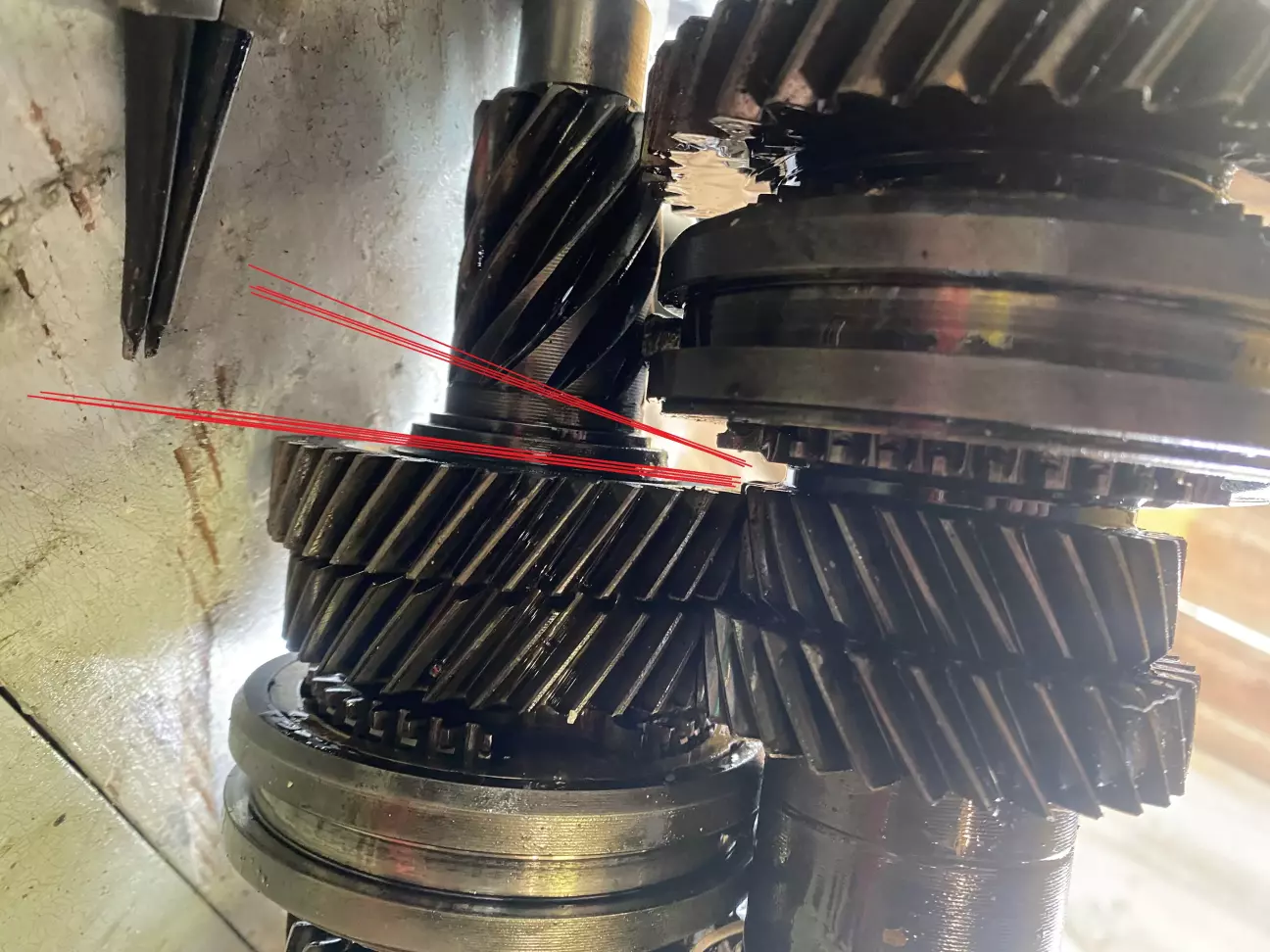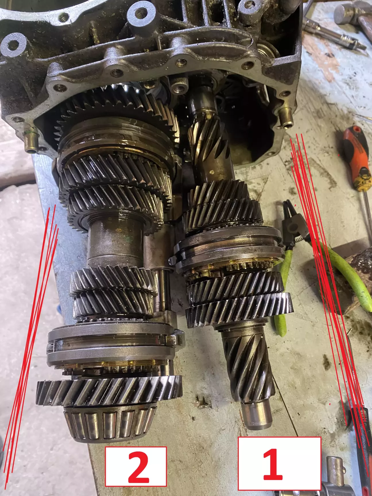 Паралельно треба підстукати через алюмінієву проставку первинний вал, але так щоб друге стопорне кільце тільки вийшло всередину коробки, і паралельно не заїхати шестернею другого валу в синхронізатор на першому валу!! Бо потім точно не знайдеш.