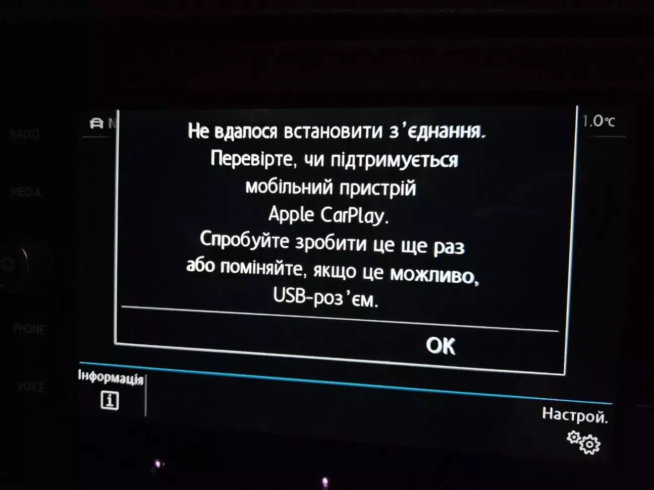 Проконсультувавшись з колегою, він мені нагадав, що це помилка характерна для модуля 5Q0035726M, який не підтримує Apple Carplay на головах Composition/Discovery Media. Віджавши тимчасово у дружини айфон, йду перевіряю, і дійсно, пристрій голова не бачить:
