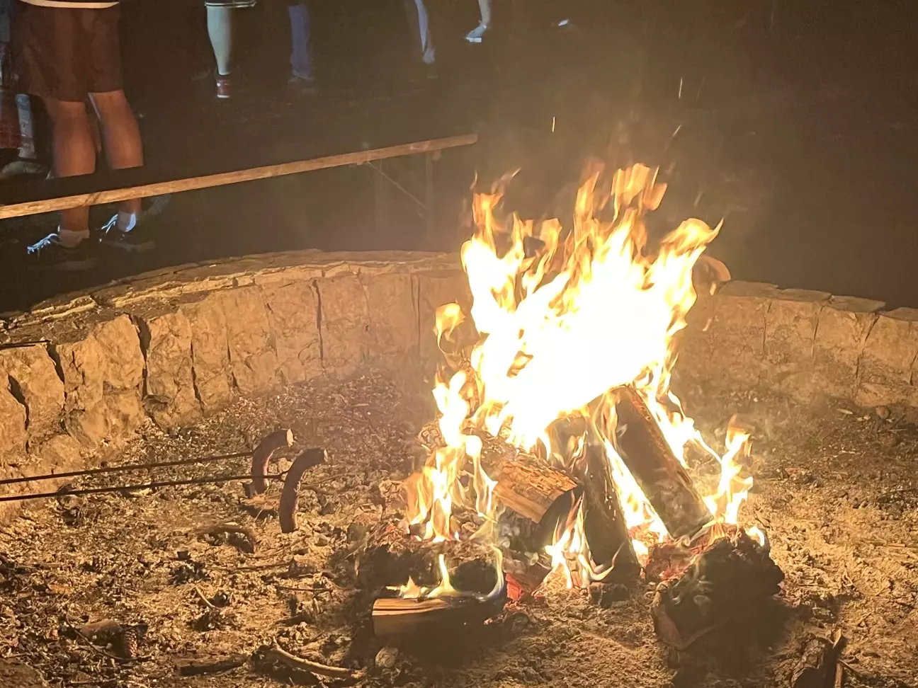 А ввечері почалася гріль-паті, до якої я до свого сорому не підготувався взагалі. Через брак мангалу, шампурів та небажання везти з собою дрова я вмовив дружину не купувати і мʼясо. Але виявилося, що те, що я спочатку вважав місцем для окультних розваг та страшних обрядів ілюмінатів, насправді було величезним «вічним вогнем», який організатори заздалегідь влаштували на лісній прогалині біля струмку.