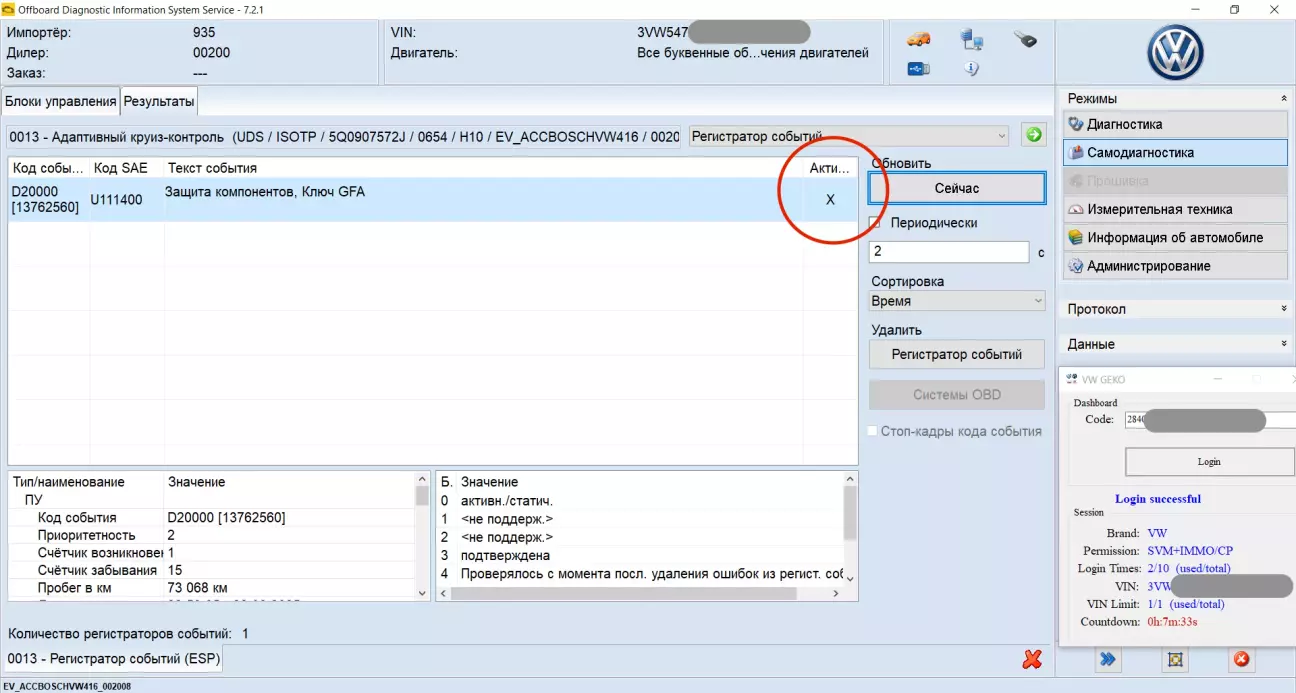 Блок виявився живим, і я біжу в ODIS S знімати захист компонентів, і чого й потрібно було чекати — доступ закінчився буквально 30 секунд тому. Після цього був куплений ще один 10 хвилин — приблизно 34 USD, і зняття захисту зайняло кілька секунд. І ті, що залишились, 9 хвилин 55 секунд мені не знадобилися, і після цього моменту онлайн не потрібен.