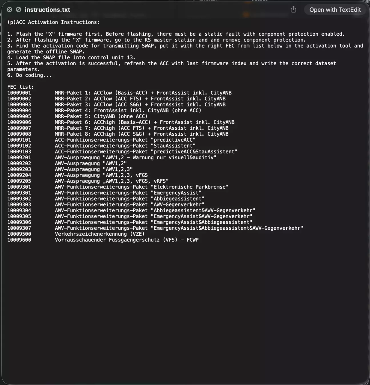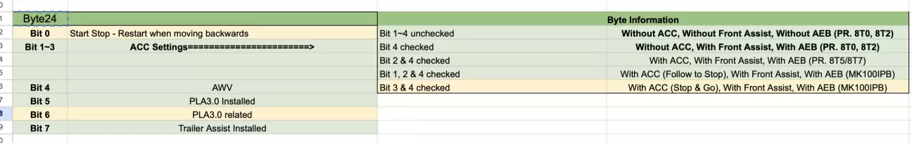 Згідно з нею, виявилось, що весь цей час я намагався ввімкнути підтримку "With ACC (Stop & Go), With Front Assist, With AEB (MK100IPB)", а Stop & Go на механіці неможливий. Нам потрібно варіант Bit 2 & 4 checked With ACC, With Front Assist, With AEB (PR. 8T5/8T7). Тобто ввімкнути замість біту 3 - біт 2.