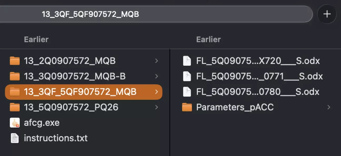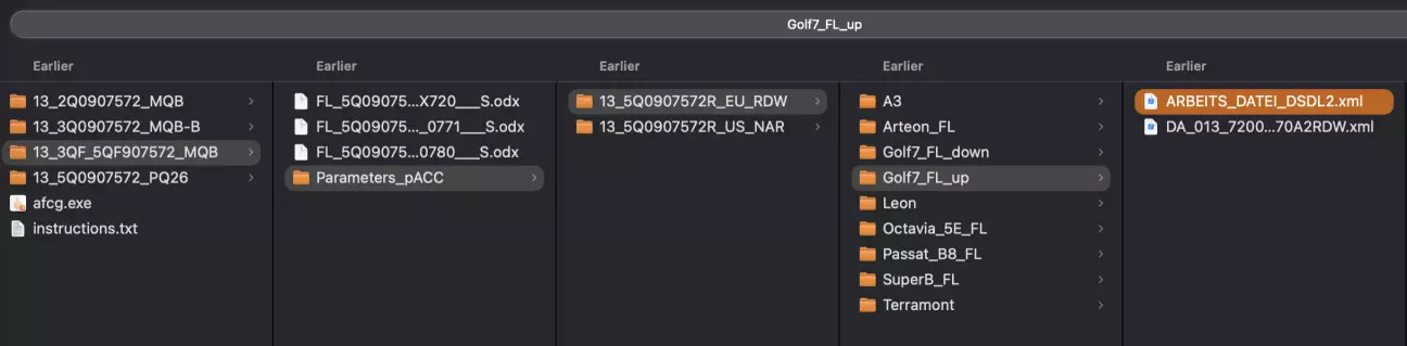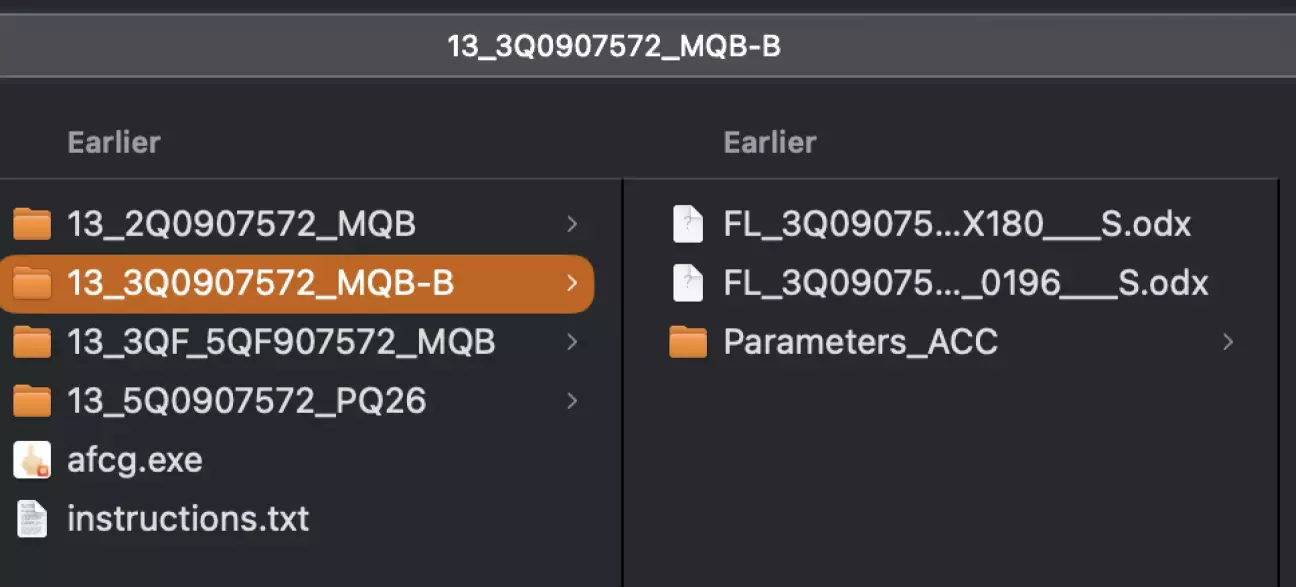 І ось я дивлюсь на ці файли, розумію, що мій — це 13_3QF_5QF907572_MQB, але в останній момент помічаю, що назва 5QF, а не 5Q0. Починаю перебирати думки в голові: 13_5Q0907572_PQ26 — не варіант, тому що для іншої платформи PQ26, 2Q теж не воно. 3Q залишається, що і підходить до мого HW номеру, але всередині прошивки з номерами X180 та 0196. Але це дуже низькі версії для мого радару (0654 у мене), і пониження версій зазвичай до добра не доводить.