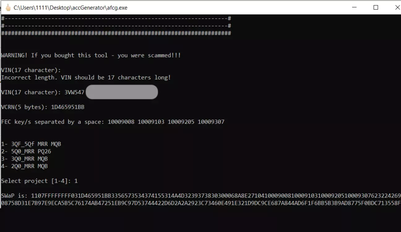 Тепер можна генерувати SWAP код->Запускаємо afcg.exe -> Вводимо наш він -> VCRN -> та коди FEC key -> вводимо цифру з нашим радаром 1-4-> отримуємо SWAP код