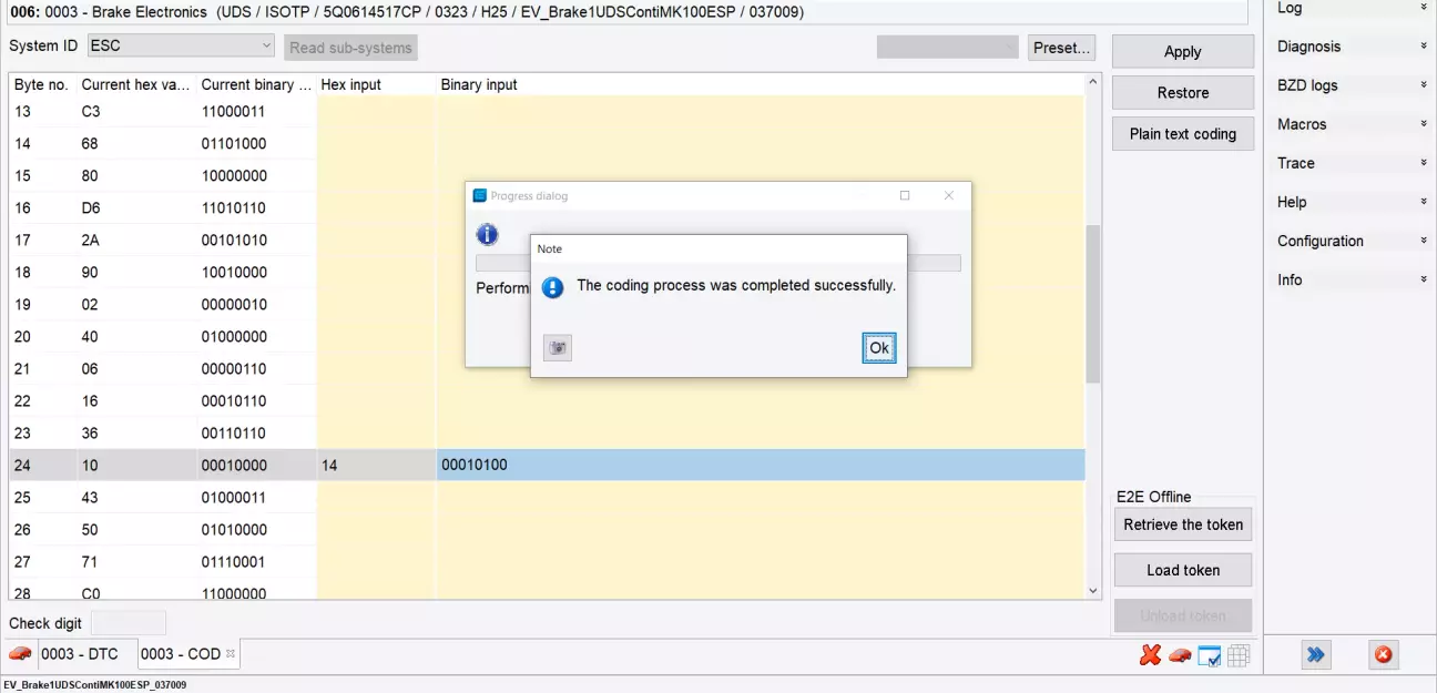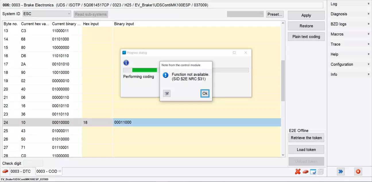 Порівнюючи його з моїм, я побачив відмінність у байті 5 і вже безнадійно записав в HEX форматі в ODIS. Виявилось, що дійсно біт 6 ввімкнувся, але разом з тим вимкнувся і мій заводський ввімкнутий біт 5. І всі помилки пішли. Перемога №3!