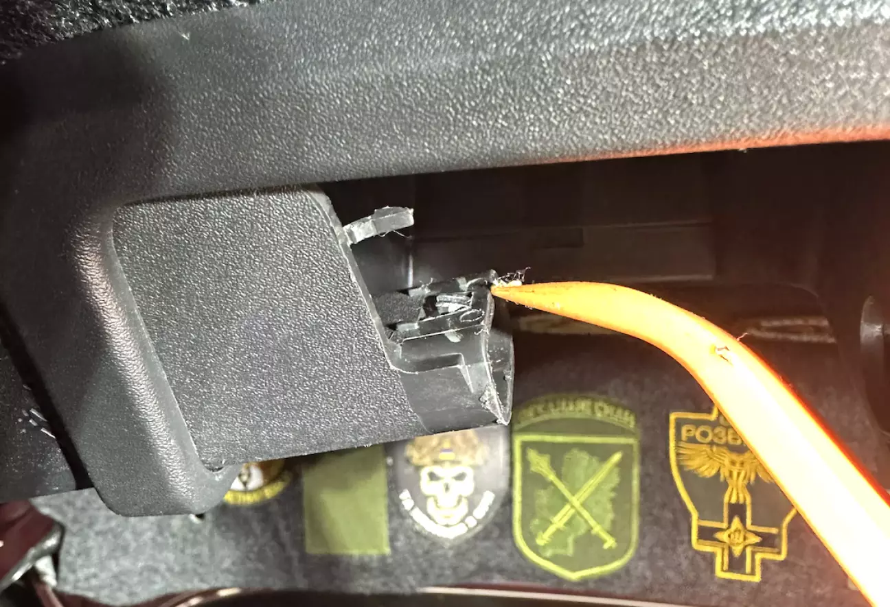 Тут ближче видно зуб, яким тримається пластик, його через обшивку справа піддівай/штовхай
