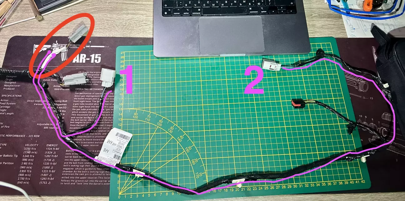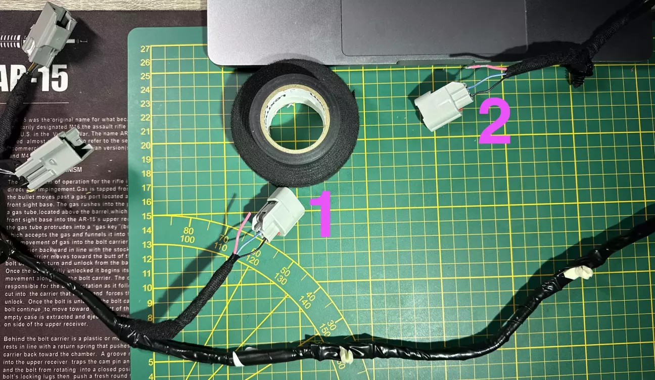 Ось тут вже вплетене живлення на габарити. Але на цьому фото не вистачає ще одного провода, який я заклав від основи проводки, до фішки №1 - по ньому потім буде йти живлення на туманку. Тож в результаті на фішку #1 (лівий стоп) повинно вийти чотири проводи, а на фішку №2 (правий стоп) - три проводи (маса, габарити, лед).