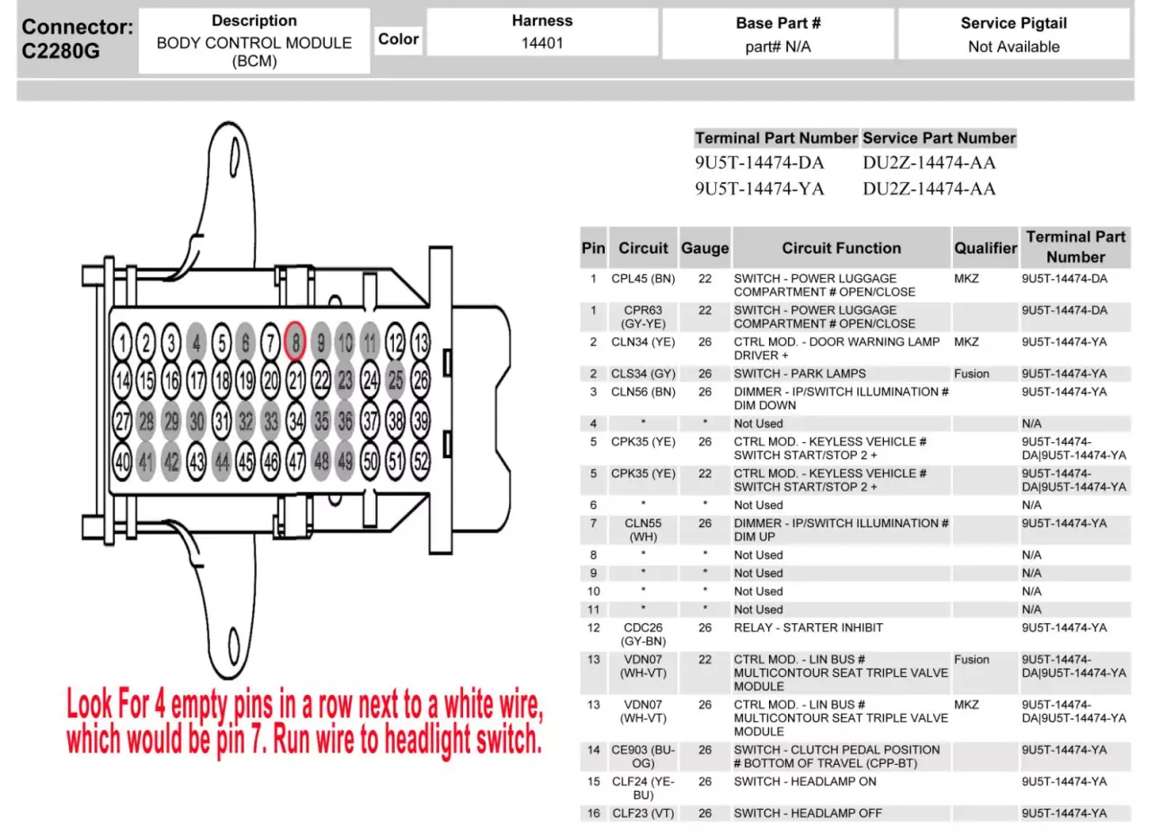 8. В сокет J2 C2280G додаємо пін #8 (менший, DU2Z-14474-AA), з нашим проводом від блоку керування світлом. Це даватиме на bcm команду при натисканні кнопки туманки (активуємо пін через forscan пізніше).