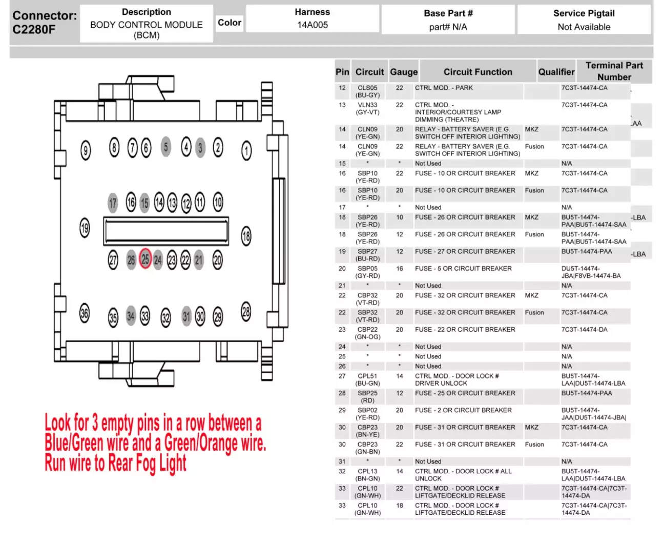 - Потім підключили довгий провід в BCM сокет C2280F в пін #25 і протягли в багажник до нашої "розширеної" коси проводки.