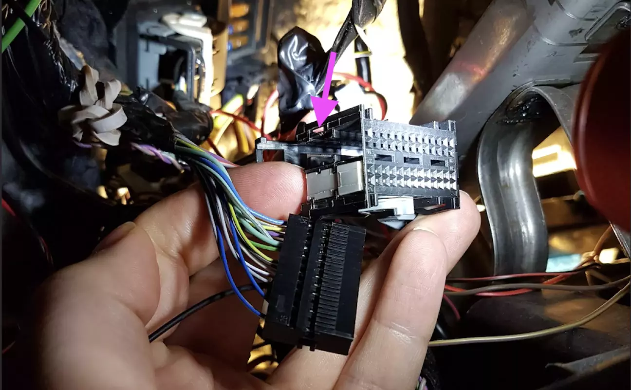 2. Про всяк варто продзвонити фішку (на фото її проводка в білій ізоленті), щоб зрозуміти на який саме провід йде 12В, коли відкривається авто (вмикається підсвітка номера), і при закритті авто там має бути нуль (коли підсвітки згасає).