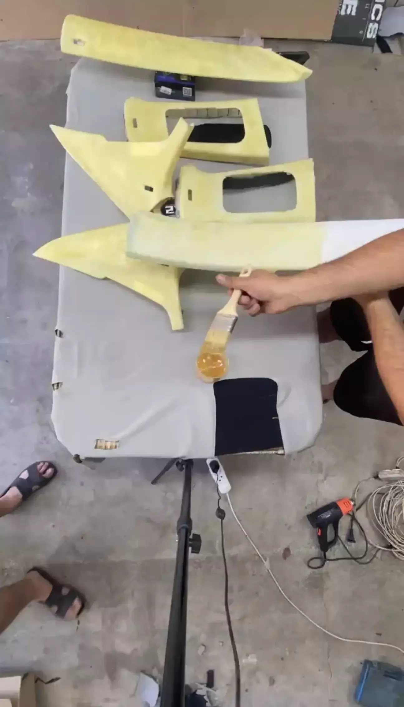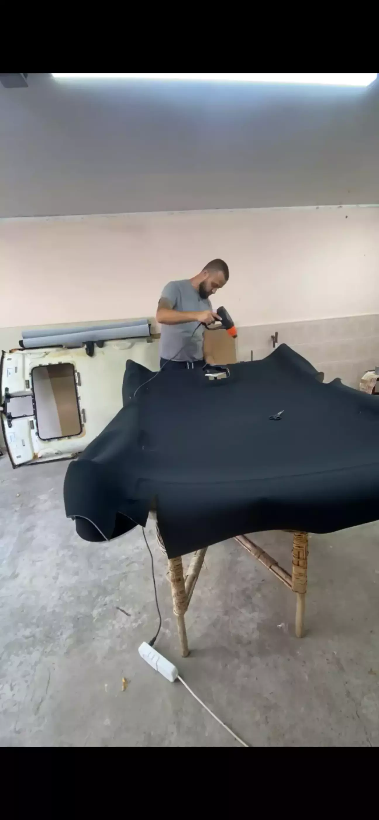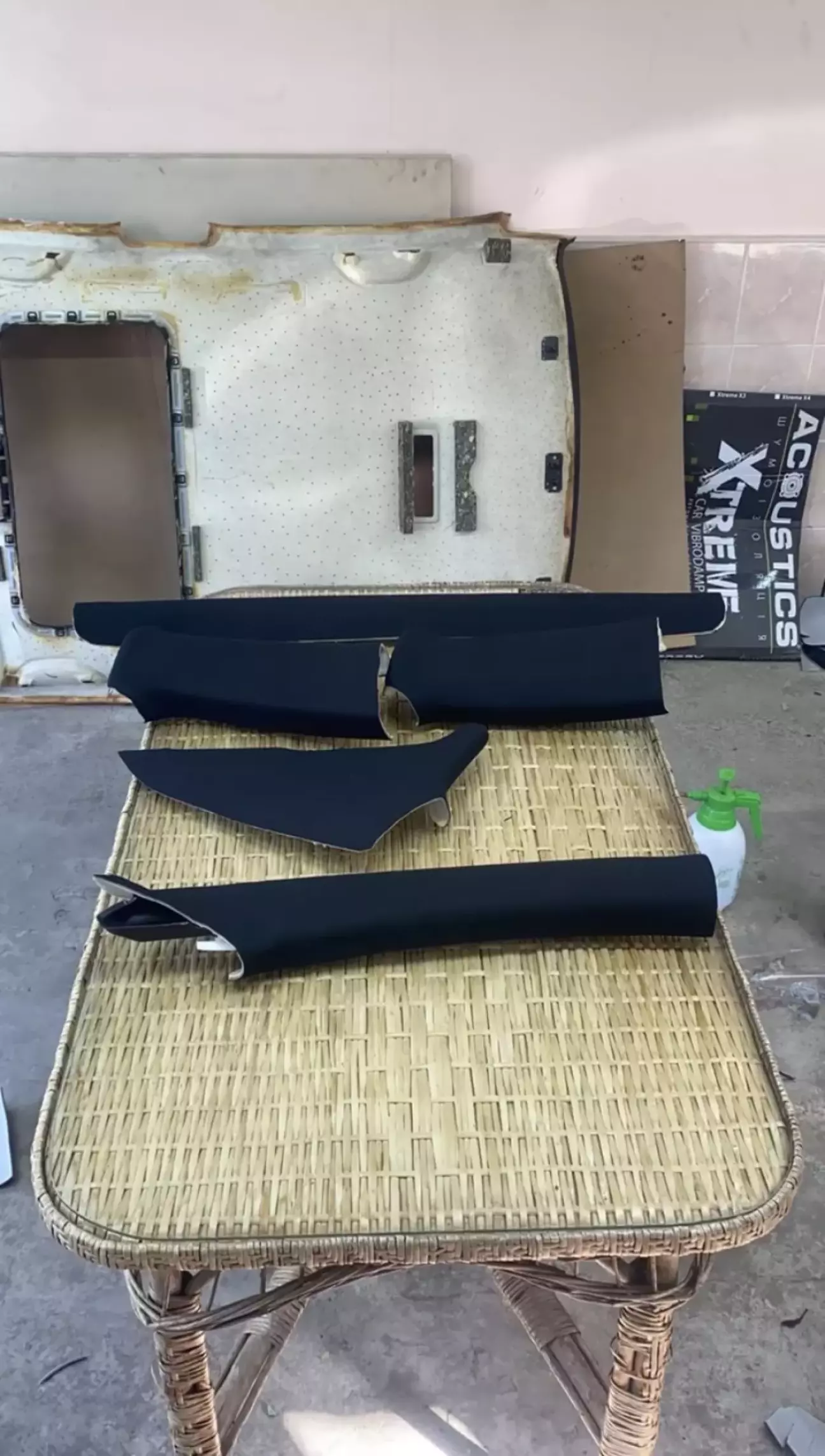 Следующий шаг это оклейка стоек, если хотите по проще и не мучатся то берите на потолок ткань с подложкой, на стойки без, тогда проще клеить и делать завороты, по заводу кстати на стойках ткань без подложки.