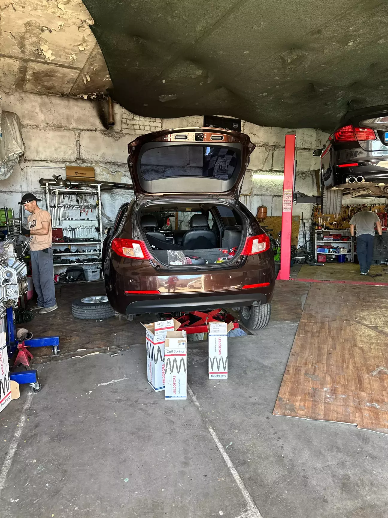 Пружины в круг, задние аммортизаторы, пыльники-отбойники СТО. Развал-схождение.