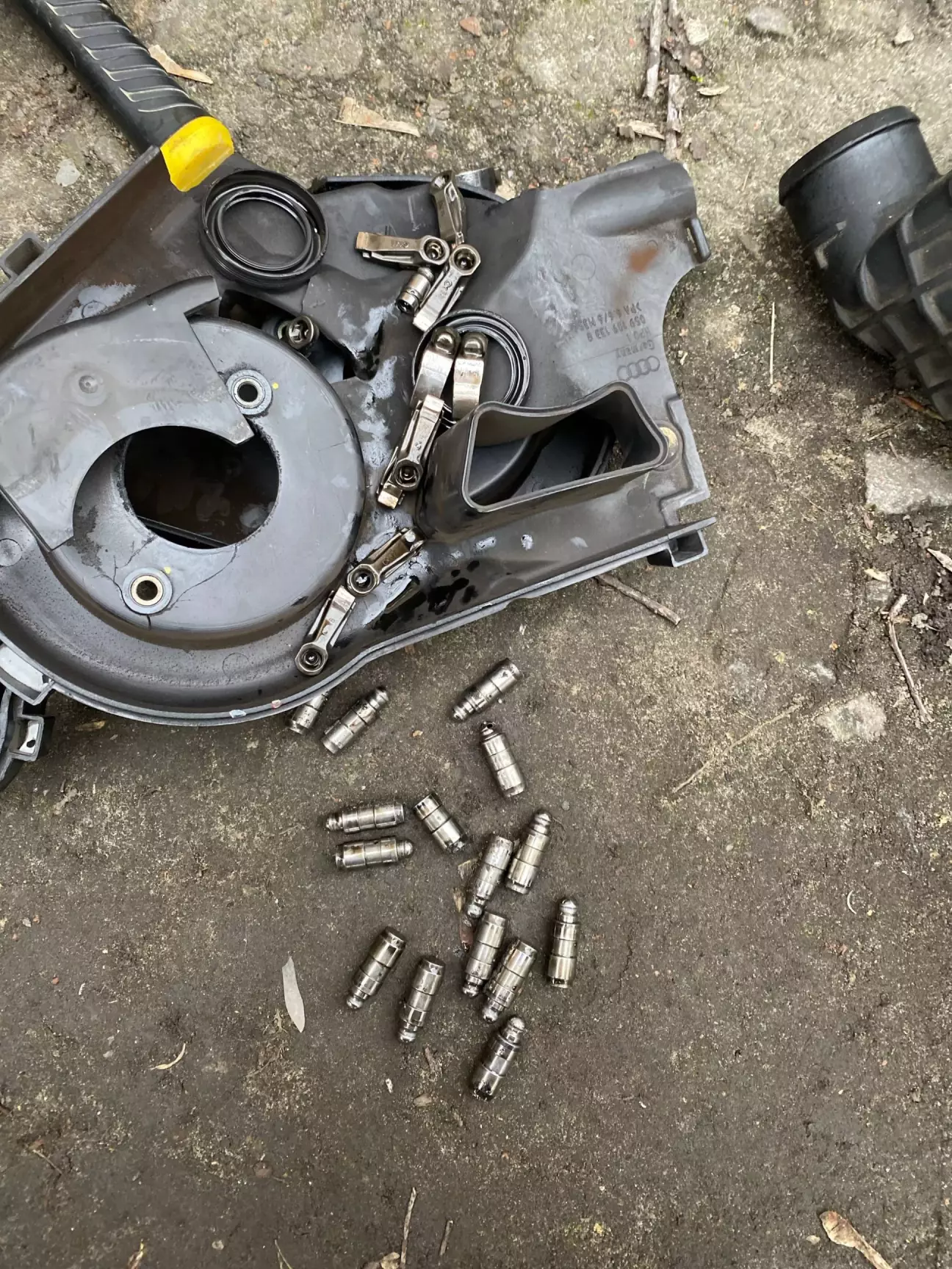 Привіт драйвери десь майже рік нічого не писав то часу немає то леньки але не переставав фоткати зміни по машині або події з машиною які відбувалися. Так ось на весні 24го року вирішив я змінити прокладки клапанних кришок бо купив їх в 20м році і все якось теж не доцього було. ну ось и прийшов їх час почав відкручувати гайки на кришці знімати всі трубочки подачу палива і оооо))) нарешті я відкрутив праву кришку і тут на мене чекає сюрприз я такий ну прям критичного нічого. але я з таким стикаюся в перше. Дивлюся а в правій голові немає рокера на місці думаю обдивившись головку знайшов лежав трохи нижче ну думаю гаразд. Повторюю дії з лівою головкою і тут дивлюся така ж ситуація тільки немає 2х рокерів і зламана голівка гідрокоменсатора і другий мертвий ну думаю капець що робить, і як же я катався весь цей час з моменту покупки машини але як не крути вона їздила і причому не слабо за межами міста там я наступав добре і ніяких проблем. Працювало рівно ну думаю добре якщо сюди вже поліз то треба поміняти повністю комплект гідрокоменсаторів і рокерів. + До всього поставив нову помпу поліз у генератор там вже на підході були щітки і контакне кільце усунув течі загалом поліз так поліз і вже робив так щоб більше туди не лазити роботи пророблено було чимало. зібрав все на місце як було по роботі особливо нічого не помітив до розбору мотора і після того як зібрав і запустив.