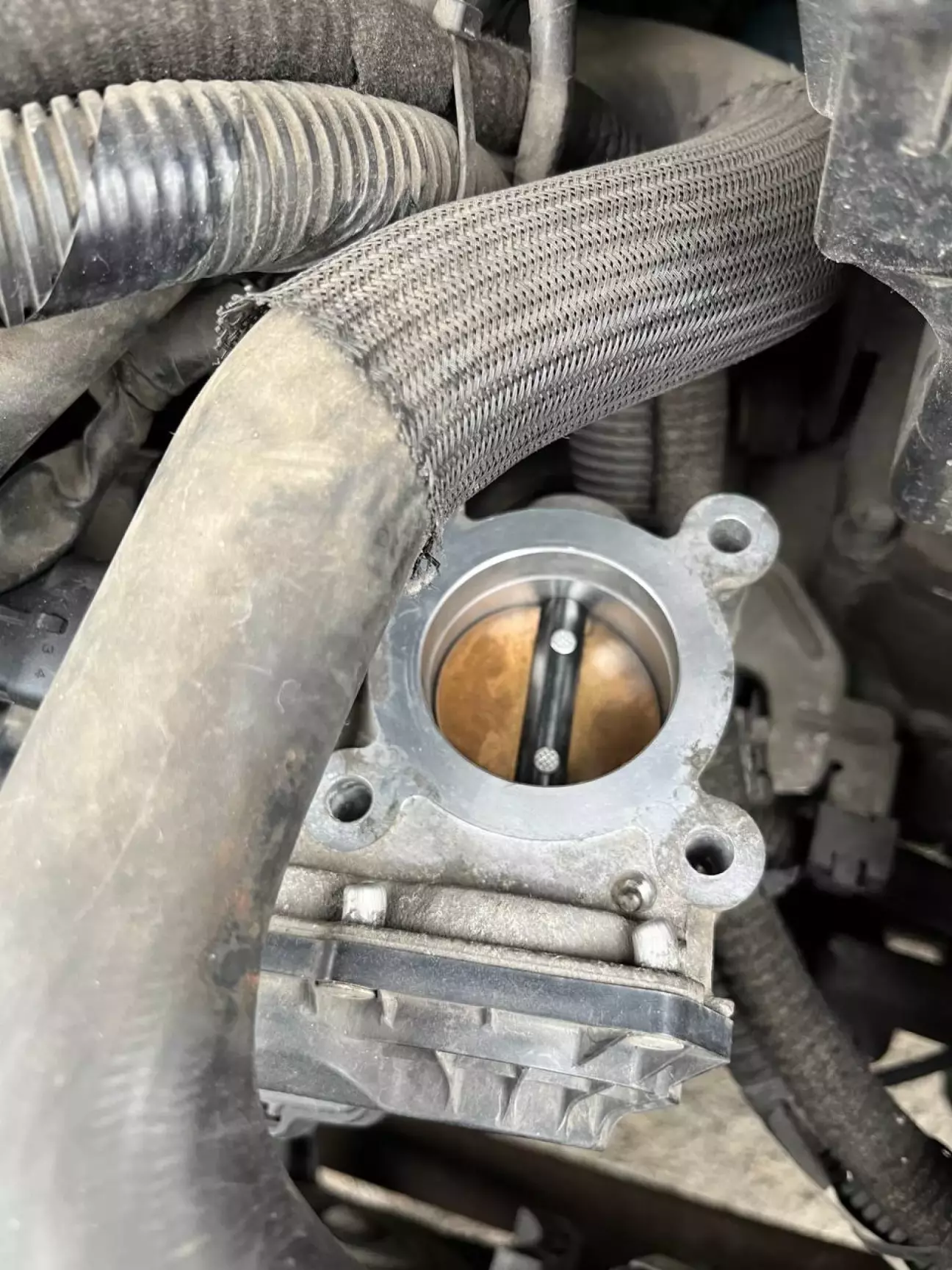 Його я чистив без повного зняття, від'єднав патрубки повітряного фільтра і зняв шланг радіатора з скоби на дроселі і от вже доступ до 4-х торксів. Заглянувши на "п'ятак" з боку повітряного фільтра, мені здалось, що він ідеально чистий, але з боку колектора була жесть.