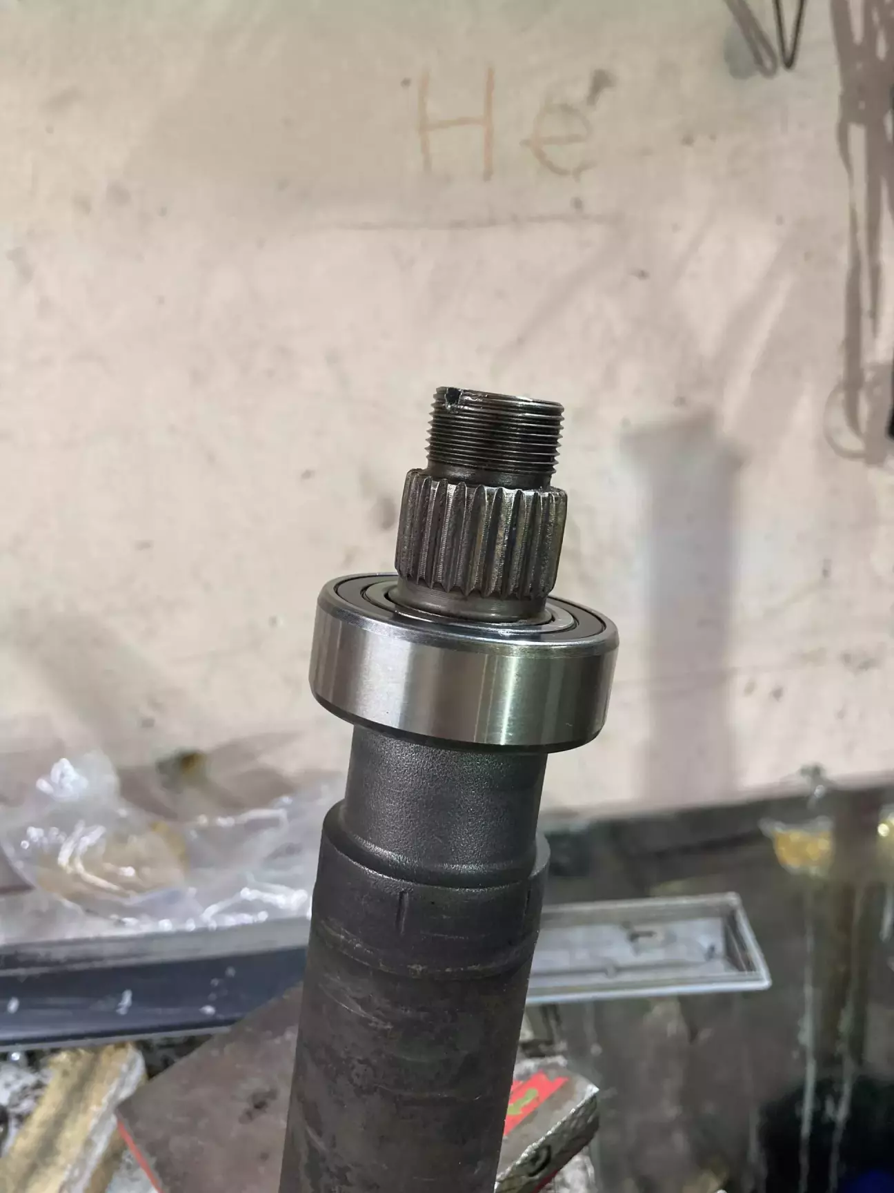 Далее можно ставить полуось в кронштейн и запрессовывать в нее подшипник. Делать прессом это оказалось неудобно, т.к. кронштейн не ровный, поэтому взял 3 болта подлиннее чем оригинальные и постепенно поочередно закручивая их, впрессовал подшипник в кронштейн.