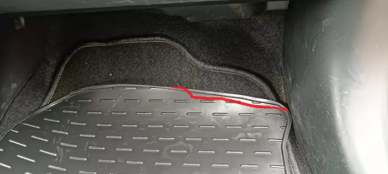 Передній ряд ліг не так ідеально як задній. В верху коврика переднього пасажира варто було б зробити маленький зріз на 1 см десь в цьому місці. Без того зрізу коврик лягає складніше і треба його заводити між пластиком і ковроліном.