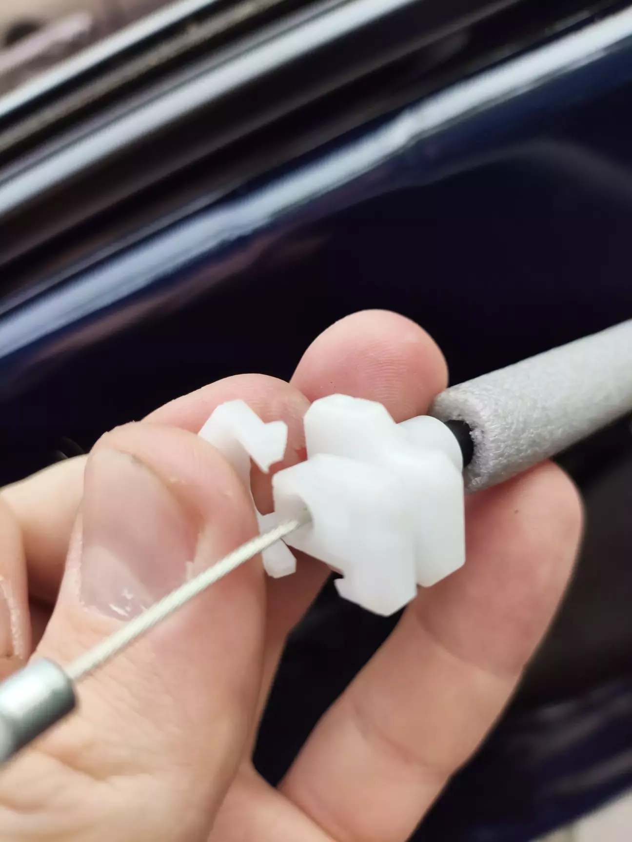 потім відщіпнути кліпси по периметру карти, акуратно здернути її вгору, і не менш акуратно відстебнути кріплення тросика дверної ручки. У мене акуратно не вийшло, тому довелося негайно відправитися на найближчу розборку за новим тросиком двері.