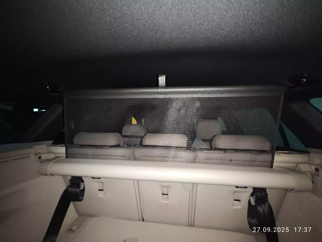 Приятным сюрпризом была задняя полка, она состоит из двух частей, одна классическая - закрывает пространство багажника от взглядов извне, вторая же часть - сетка, натягивается для предотвращения полета вещей из багажника в салон, благодаря чему можно безопасно грузить багажник под потолок. Подозреваю что есть еще какие-то секреты в организации багажного пространства, так как в потолке присутствуют проушины для сетки сразу за водительским сиденьем, что при сложенном заднем ряде теоретически организует багажный отсек обьемом ~ 1,6м3.
