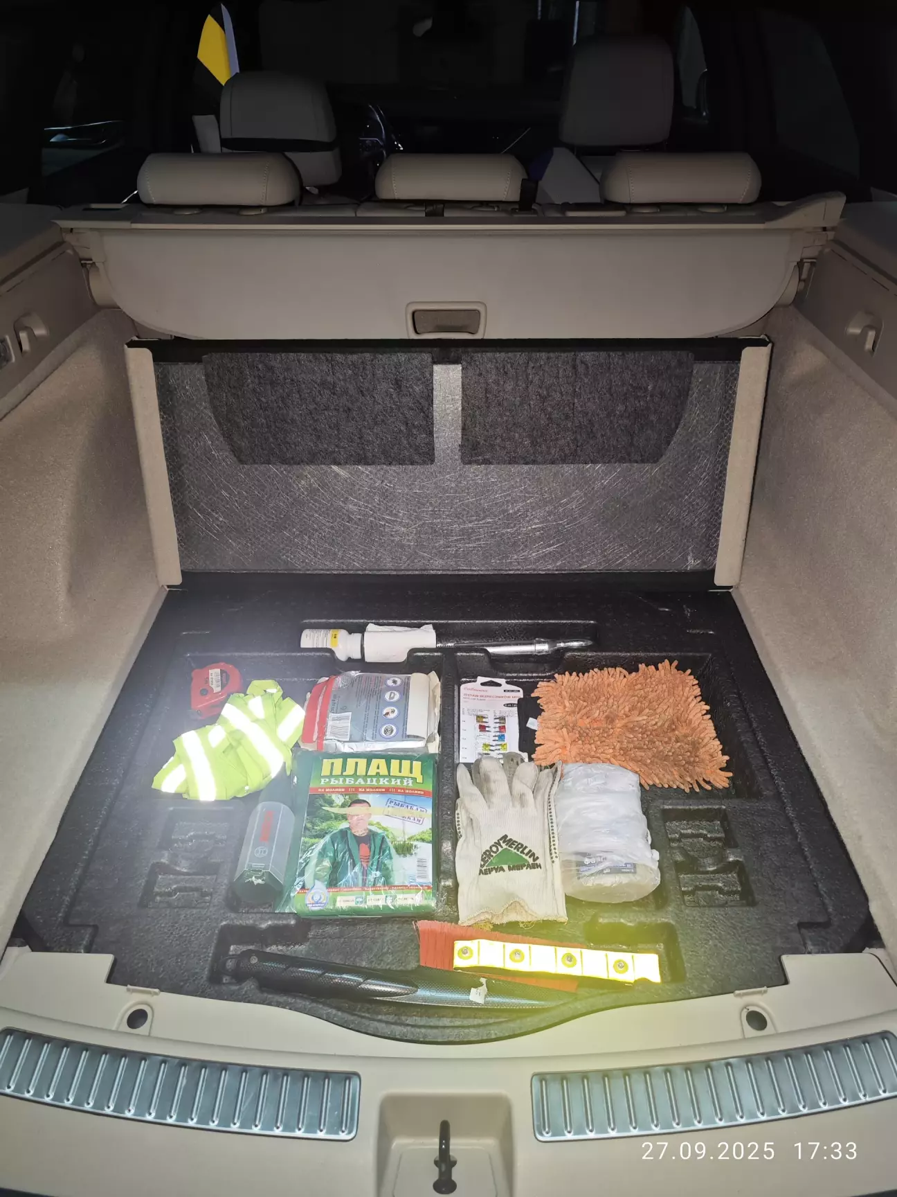 Под пенопластом имеем сабчик штатного звука в пенопластовой облицовке, в которой также нашелся штатный ремкомплект для ремонта шин: компресор и жижа. Вокруг пенопласта влезли буксировочный трос, огнетушитель, ремни для крепежа багажа, багажная сетка, провода для "прикурки" (спорное решение, так как электроляда не откроется при севшем акуме, не уверен что доберусь за проводами из салона, нужно будет придумать им другое место).