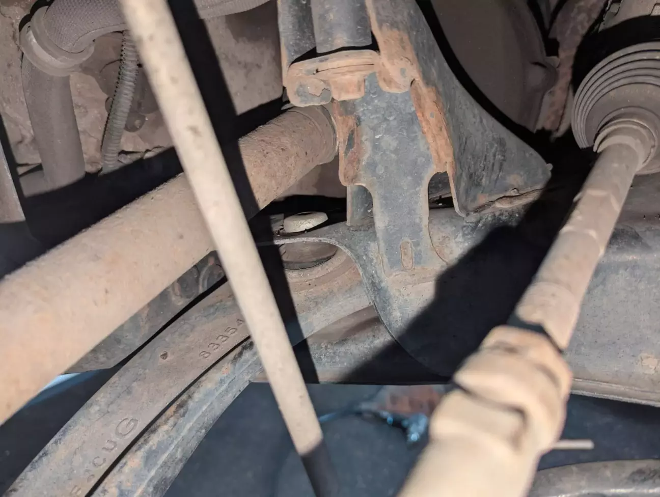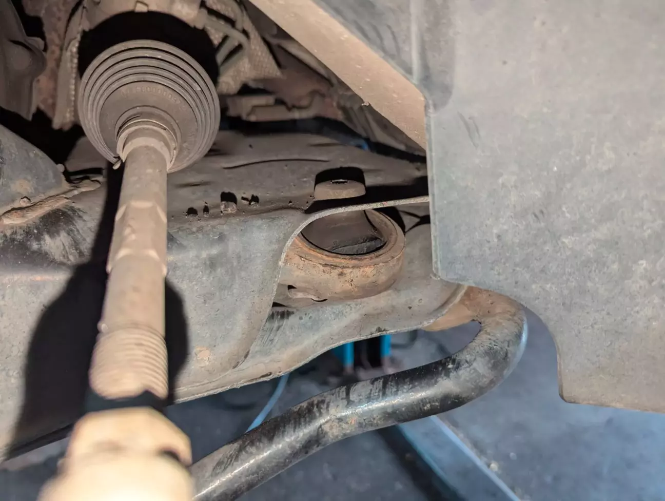 В процессе замены стоек, которые описаны в предыдущем посте, мастер позвал меня и показал на подорванный сайлентблок. Сказал, что ему скоро придёт конец. Левый пыльник рулевой рейки тоже был запотевший.
