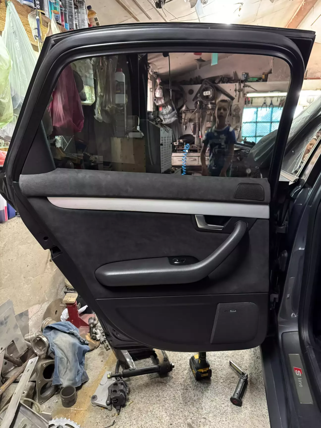 ее со времен установки задних электростеклоподьемников не перетянул еще, пипка от ручки так и торчала… алькантара лежала уже год или больше, правая карта перетянута когда замок менял в двери… так же еще года полтора назад купил все сетки внутренние BOSE, три поставил в течении года, осталась последняя карта) короче довел дело до конца, перетянул и перепаял сетку, все по феншую в коем то веке))