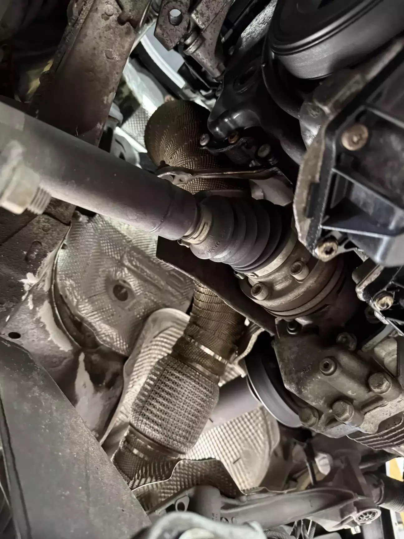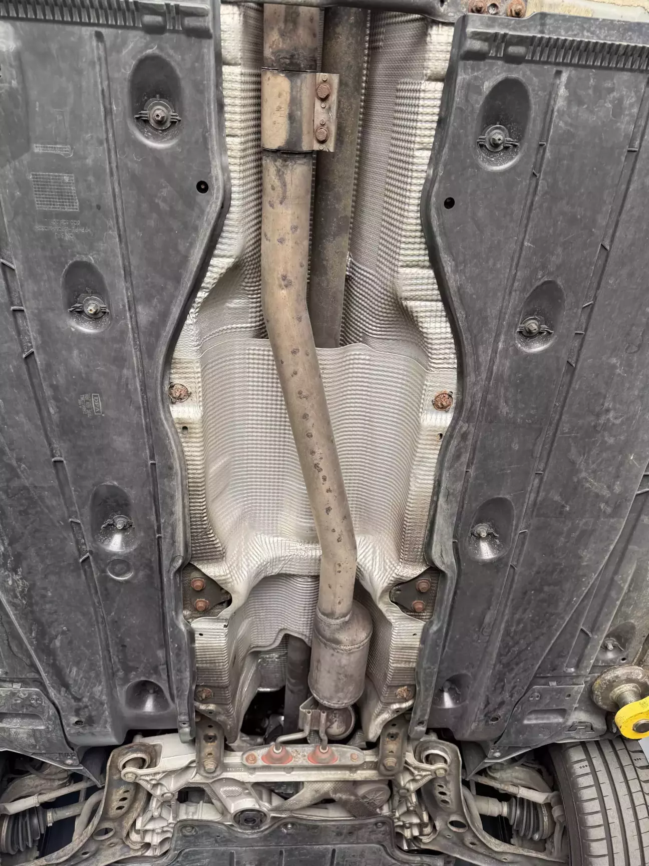 На наступний день Дімон поїхав на роботу і все встановив собі. Прийшлось розбирати підрамник, відкручувати рейку, стабілізатор, нижню подушку ітд ітп., тому в гаражі на ямі це було б дуже тяжко і довго. А через декілька днів дійшла і моя черга. Я приїхав, десь біля двох годин і все на місці. Стики труб саджали на герметик, наче все тримає і не сіфонить. Ось так він виглядає знизу: