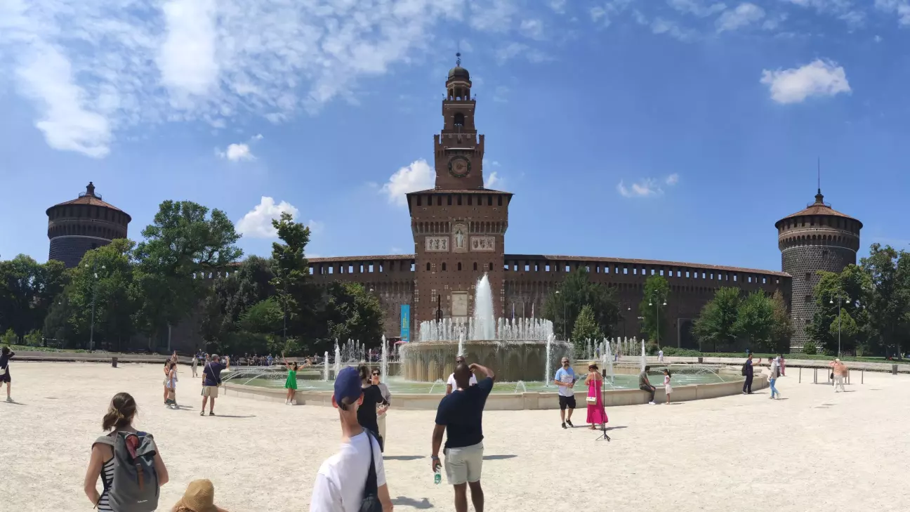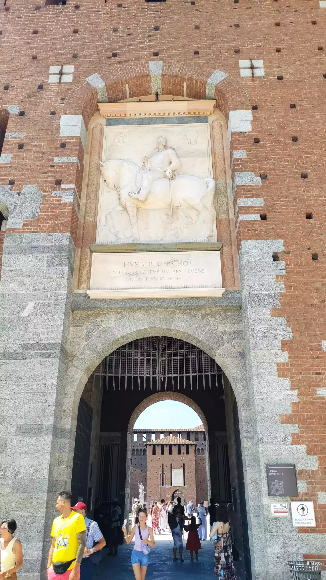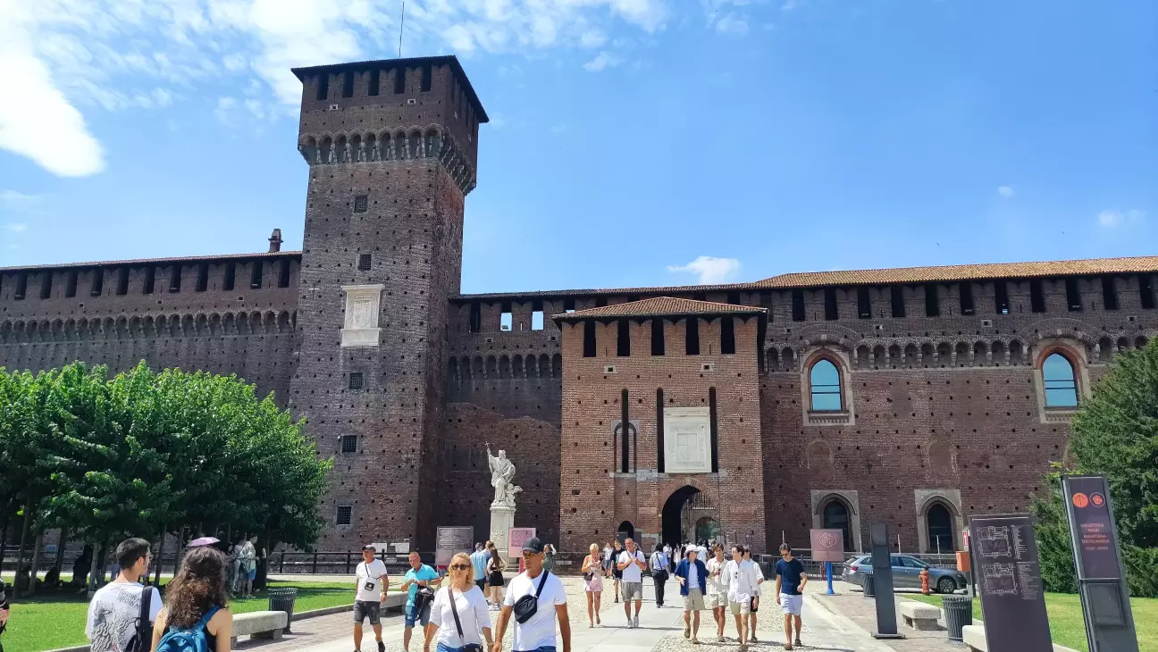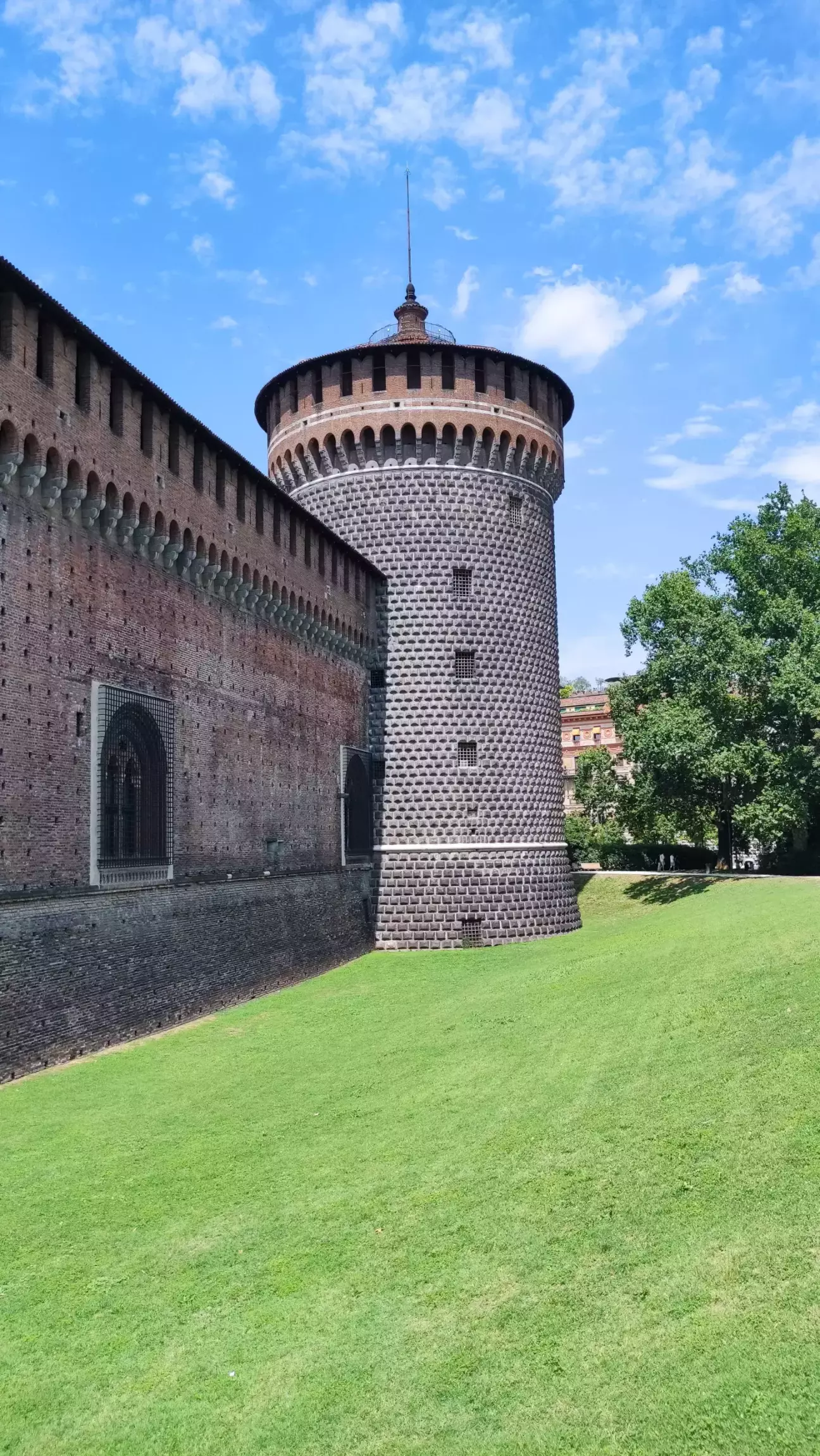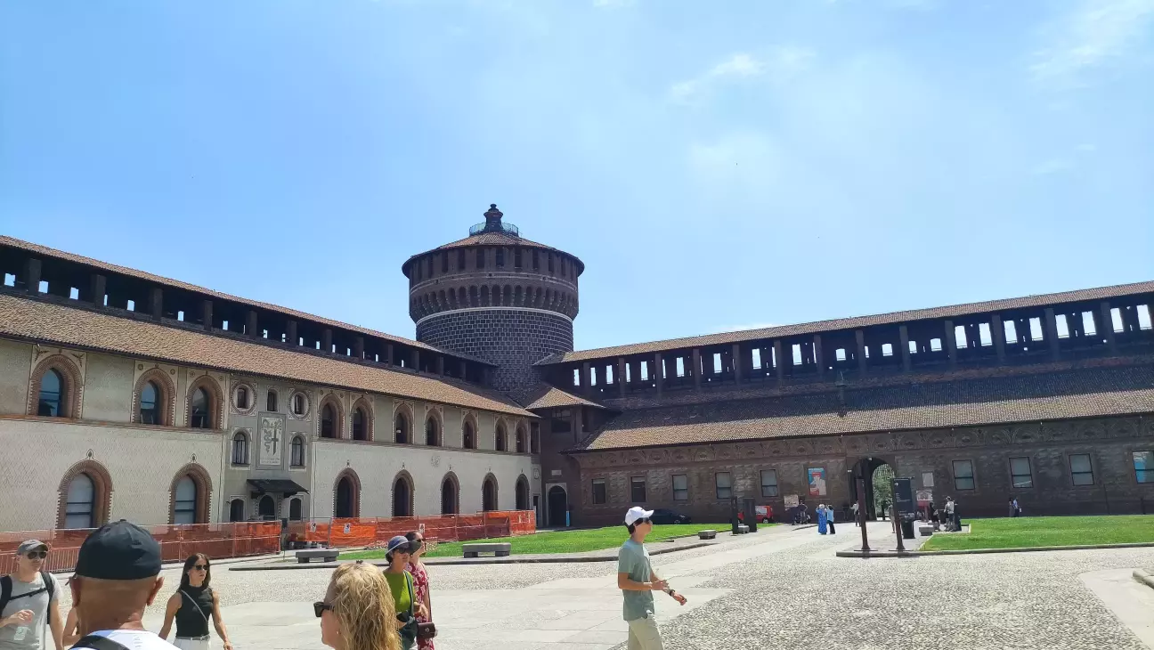 Вийшли з трамвая ми біля замку Сфорца, перетворений в епоху Відродження на елегантний двір міланських герцогів. Його збудовано на місці старої фортеці у 15му ст. Фортеця була однією з найбільших того часу, і настільки потужна, що замок ніколи не був завойований у битві. Використовуваний виключно як військові казарми іноземними урядами, він був відновлений і перетворений наприкінці 19го ст. на великий музейний комплекс, прикрашений садами однойменної площі та парком Семпіоне. Замок неймовірно мальовничий і дуже добре збережений як для італійських замків.