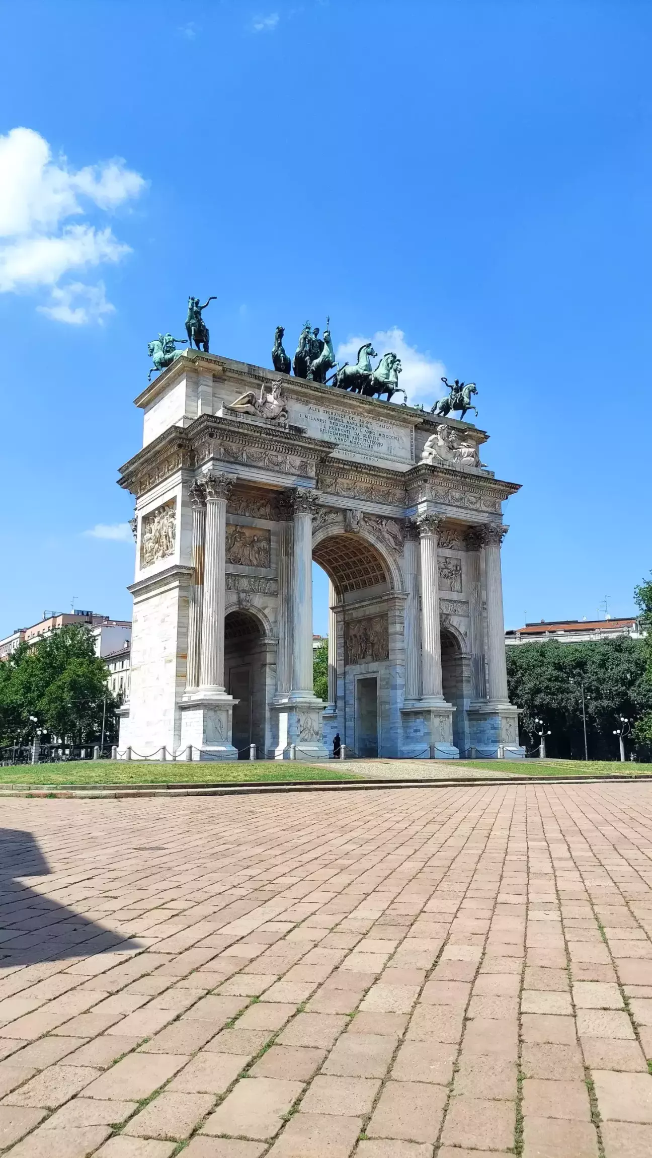 Пройшовши через замок і прогулявши трохи парком моя сім'я заявила, що по цій спеці воліє залишитися відпочивати в парку біля замку, а в мене є час, щоб прочесати істоичний центр і спокійно познайомитися з цікавинками. Ок, виклик прийнято))) Триумфальна арка Миру знаходиться одразу за парком і є одним з головних неокласичних пам'ятників Мілана. Перший камінь «арки перемоги» на честь першої річниці перемоги французів у битві при Єні над пруською армією, було закладено у жовтні 1807го р.