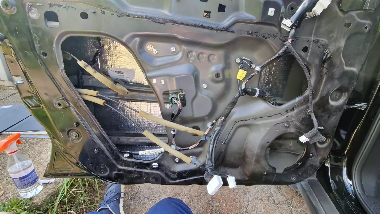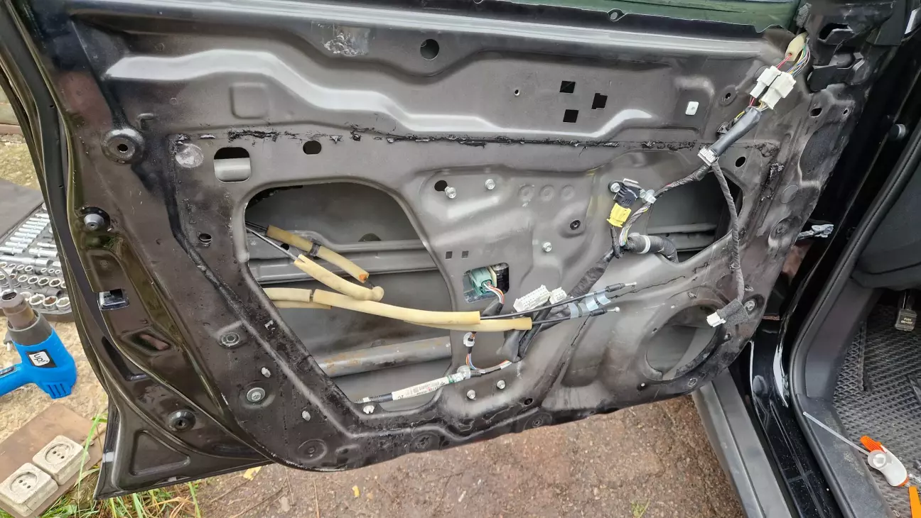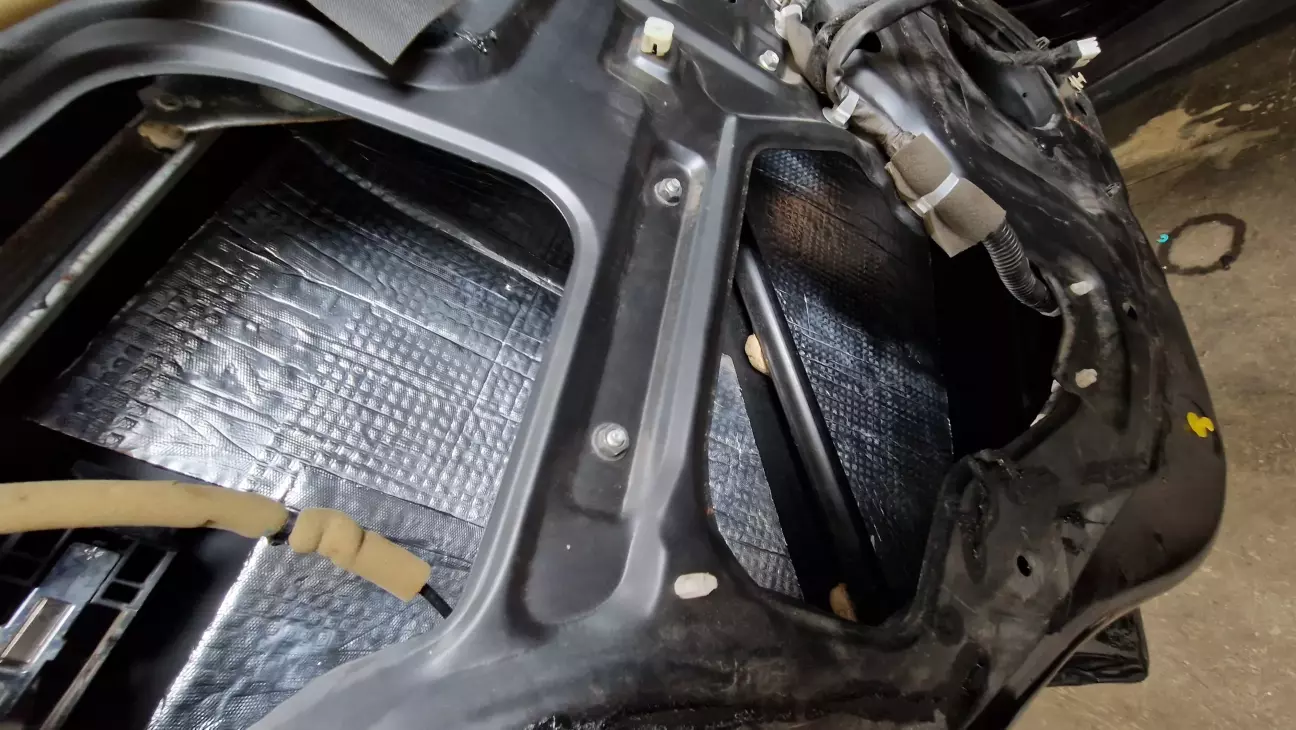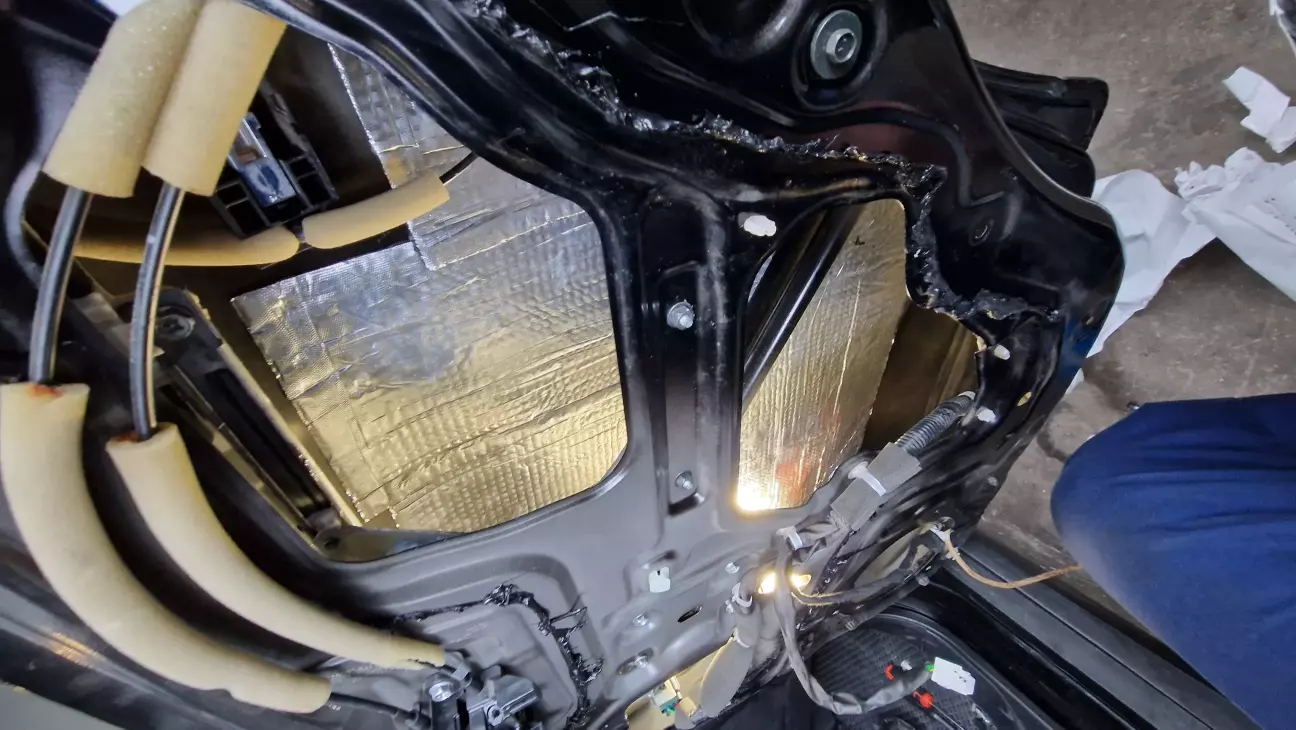Ні для кого не секрет що у роуга двері дзвінкі як консервна банка, коли закриваєш авто то навіть чутно легкий дзвін. Рішення просте, шумо-віброізоляція (далі ШВІ) дверей, взяв в епіцентрі вібру 2мм і каучукову шумку 10мм, приємно було працювати з дверями роуга, багато вільного доступу і так, я був перший хто знімав дверні карти. Всі дверки обклеяні в середині, мовілю в аейрозолі заодно пролив низ дверей аби як двері служижили роками і не підавались корозії.