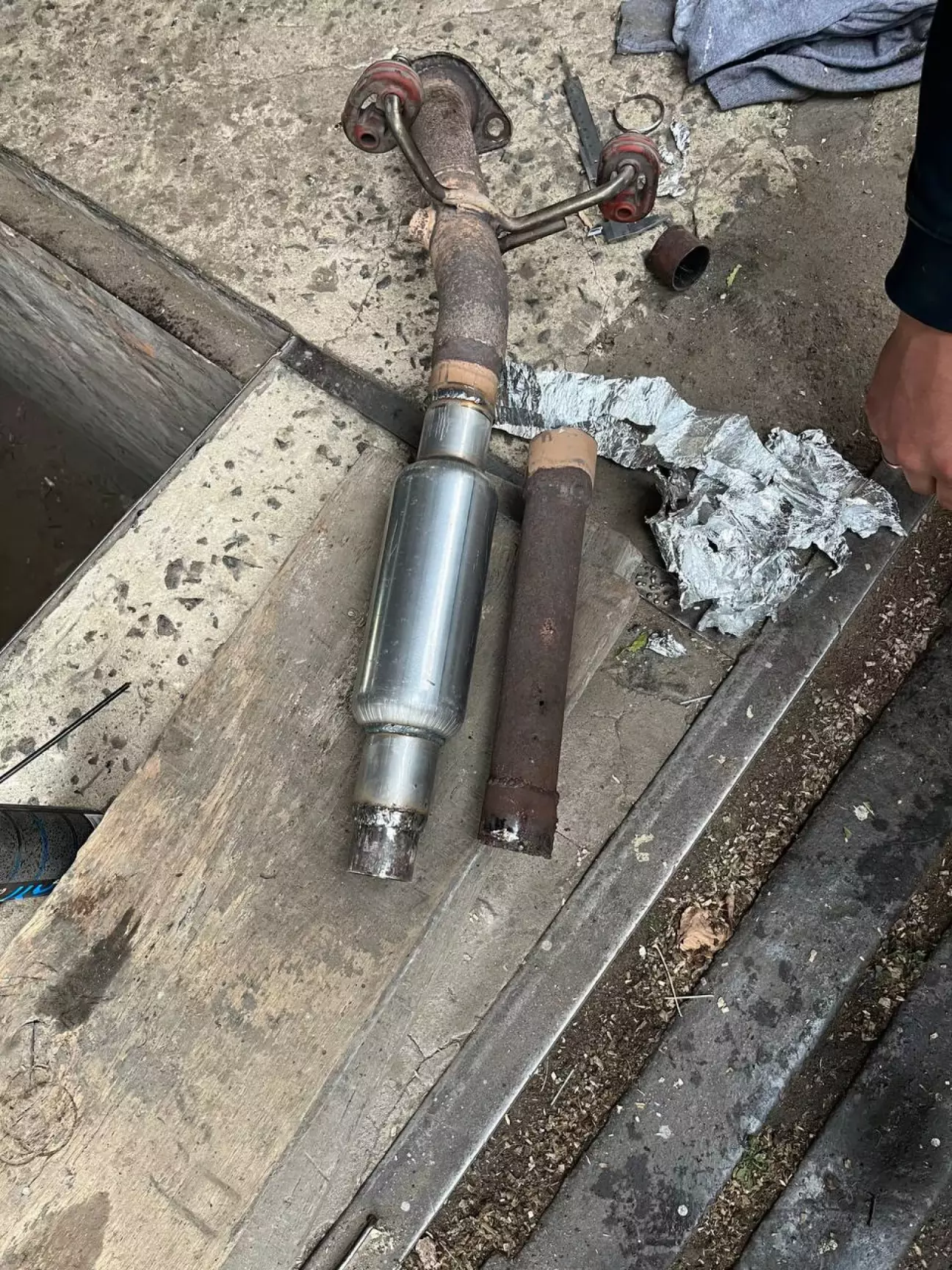 Як я згадував у цьому дописі трубі, котру вварили пригонщики на місце каталізатора 5+ років назад, залишилось не довго. Попереднього ремонту вистачило на 4 місяці і труба знову стала як сито. Я хотів повернути кат, проте це почекає, тож було вирішено замінити частину прогорілого на стронгер. Також за цей час, з'явилась ще одна біда, частково прогоріла різьба кріплення другої лямбди, тож і цю частину також варто було замінити на ремонтну.