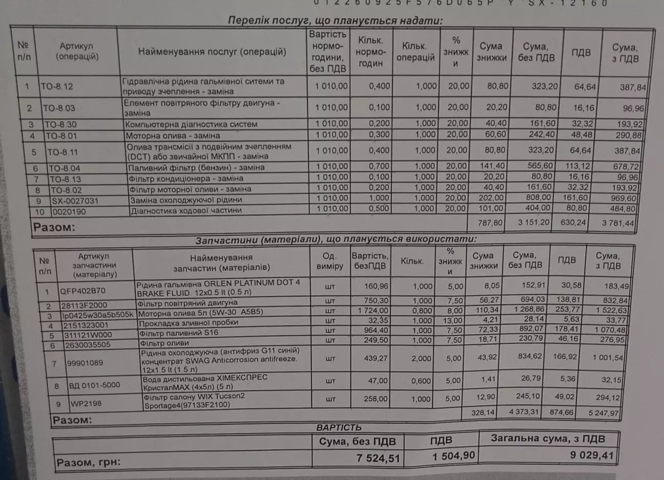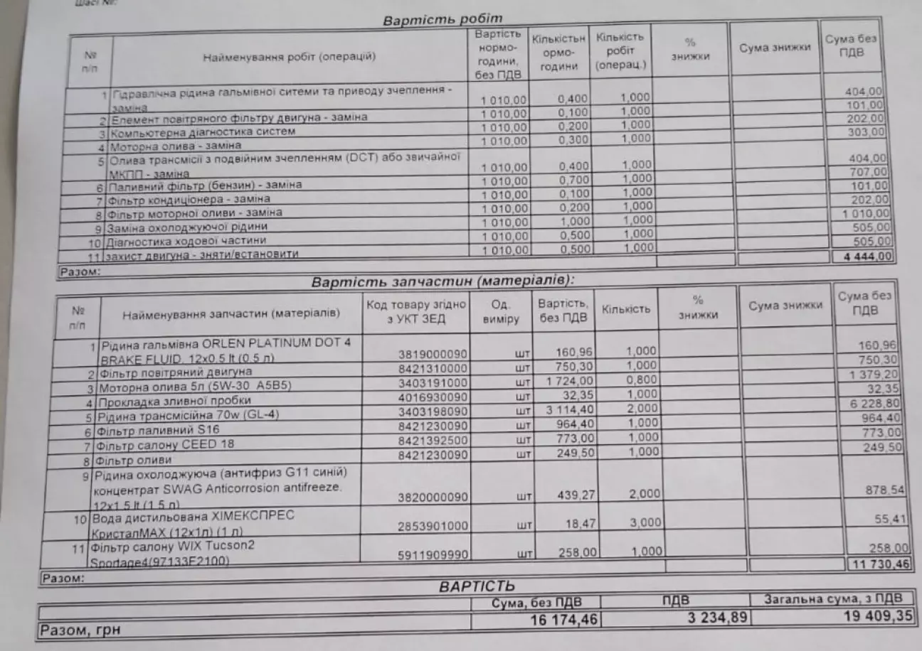 При перегляді побачив ряд помилок, так фільтр салону прораховано два рази, присутні роботи на зняття захисту, якого не має, не врахована знижка. А головне – вартість оливи для DCT – так необхідно тільки 2 літра, але вартість за пляшку – майже 3200 і це без ПДВ.