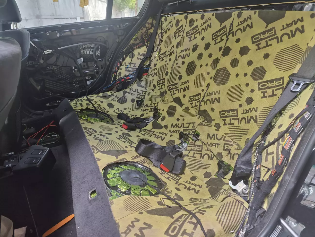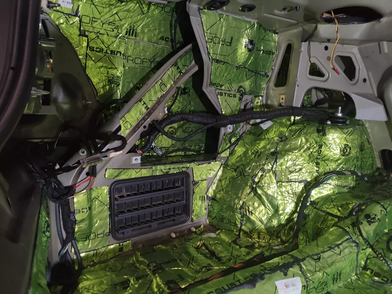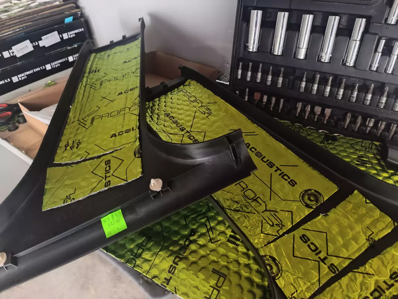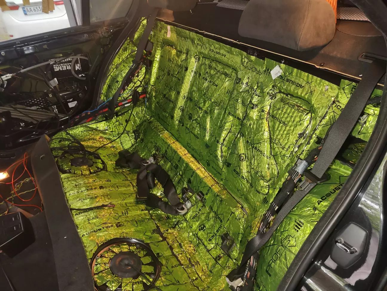 Привіт. Прийшла черга базової аудіопідготовки кузову. Того літа я зробив ШВІ тільки передніх дверей - результат є, але вимагається більше. Це звісно ніколи не дає гробову тишу, як в умовних Rolls Royce (хто вивчав як зібрані ті машини, думаю зрозуміє, що не в шумці і вібрі основний твіст, бо шумоізоляційних матеріалів там досить мало). Багато людей заявляють, що якість аудіосистеми відчутна лише коли ти слухаєш музику на заглушену. Що ж, на мою скромну думку, гарна шумоізоляція салону робить так, що і при їзді відчуваєш, за що були заплачені гроші. Те, що під час руху змінюється баланс частот в ту чи іншу сторону, корелюється тонкомпенсацією в будь якому достойному DSP, при такій необхідності.