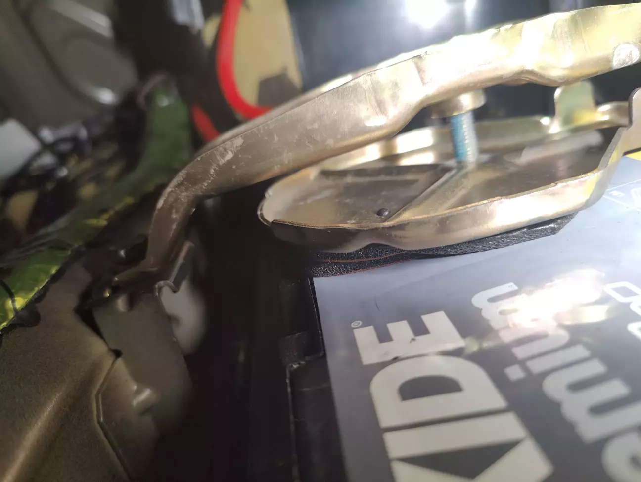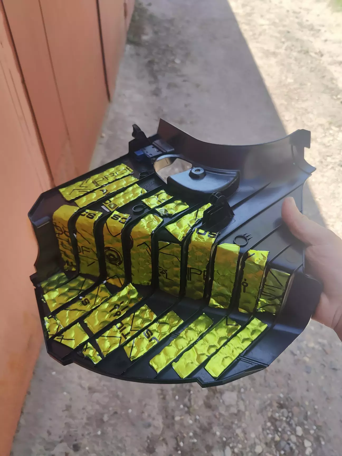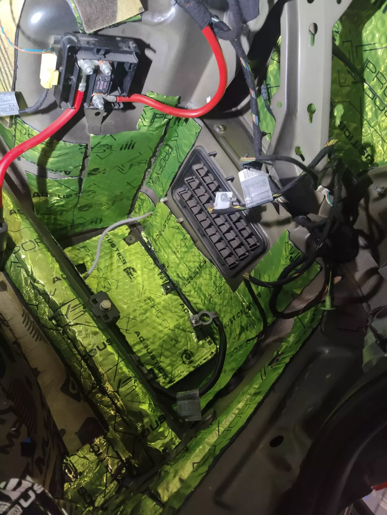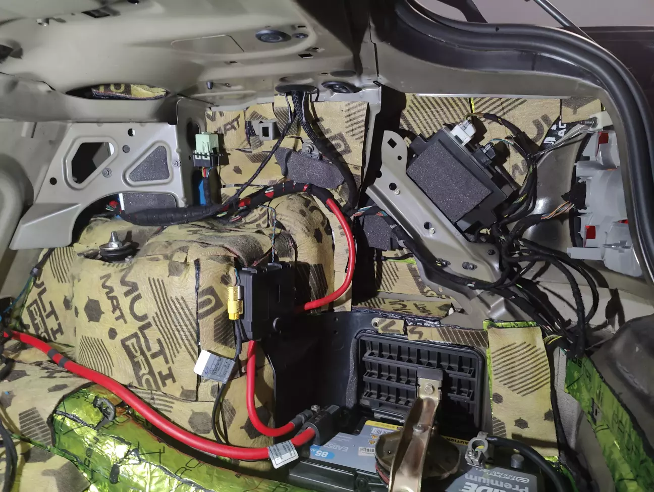 Щоб йому було тепліше і по домашньому, закатав аналогічно. Оскільки мій акумулятор нижче заводського, додав 2 слої сендвіча, щоб він притискався щільніше. Антискрип і тут скрізь де знайшлось йому місце: на кришці запобіжника, на захисному пластику тощо. Всю проводку зафіксував як можна міцніше.