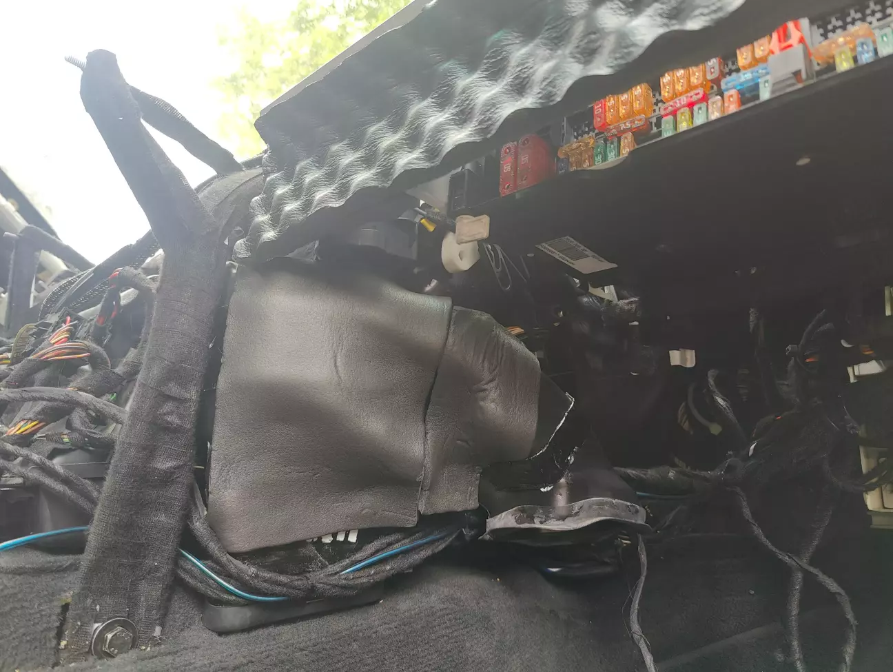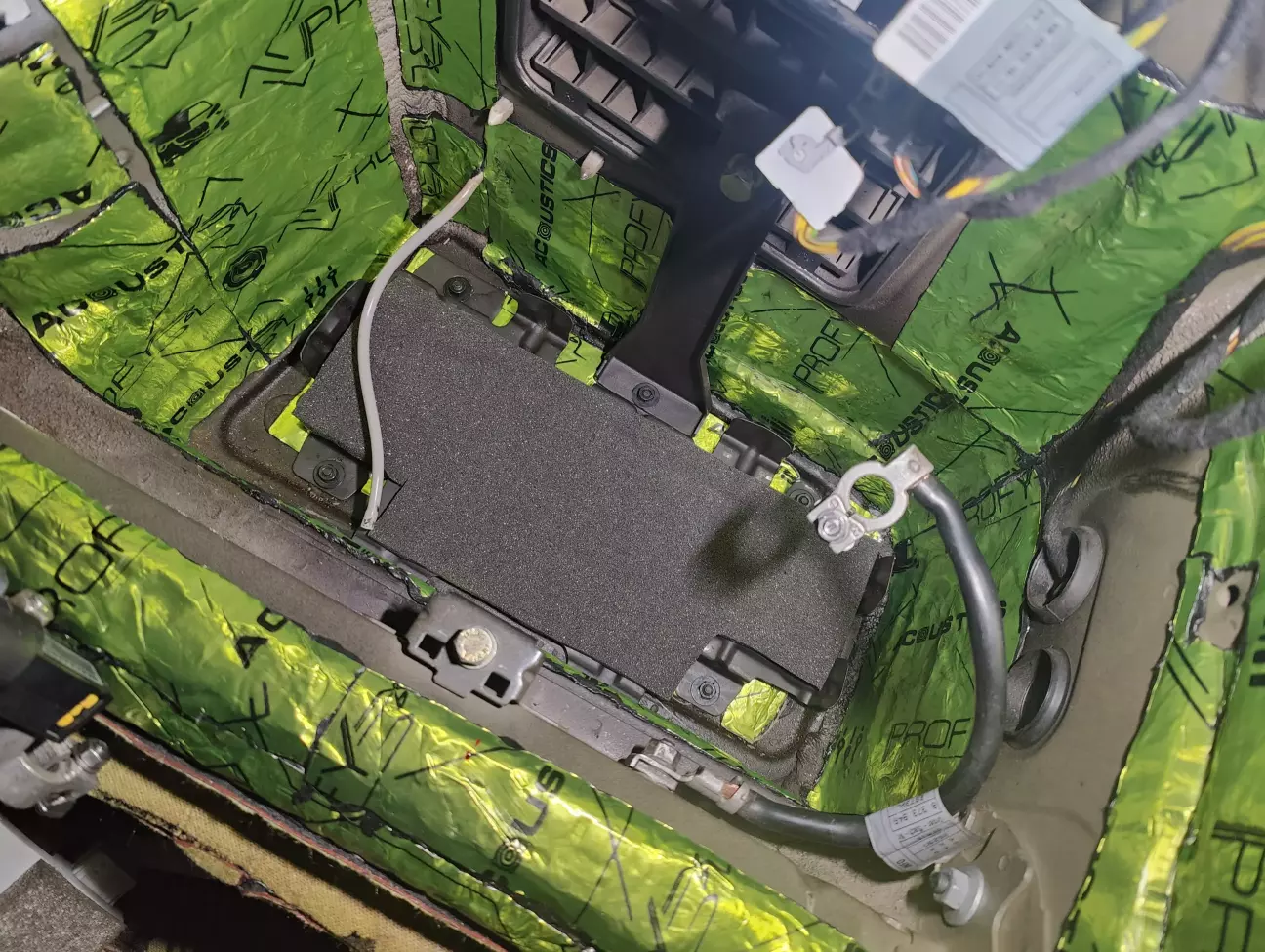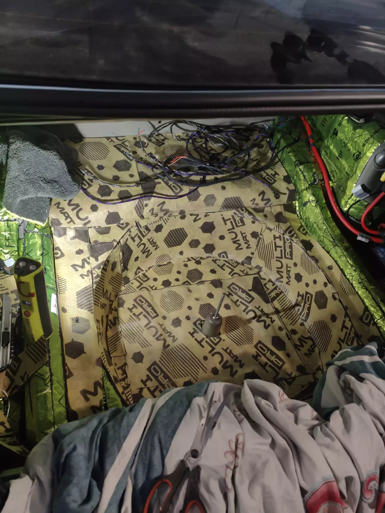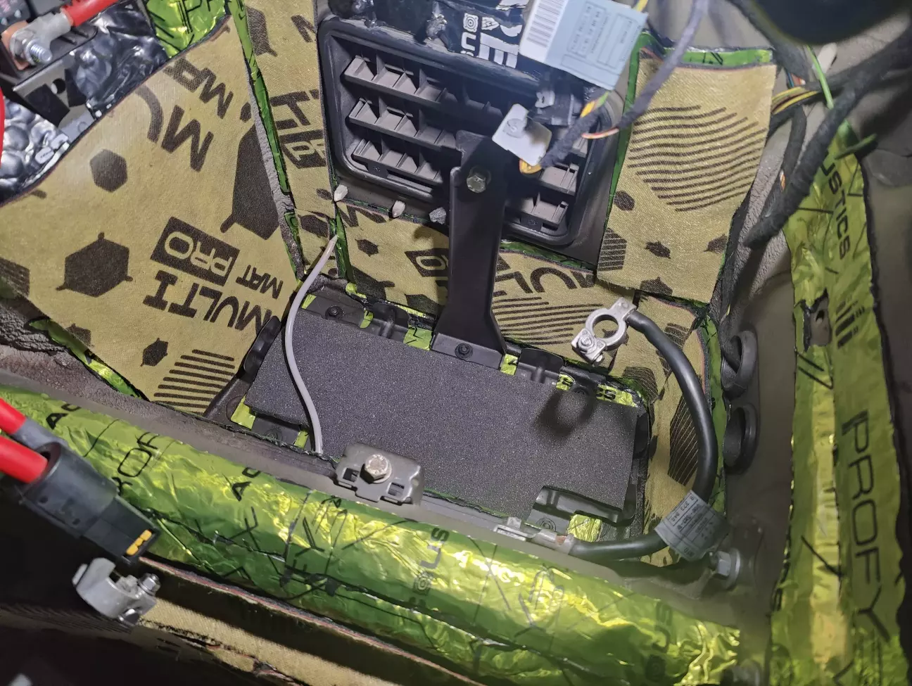 Щоб йому було тепліше і по домашньому, закатав аналогічно. Оскільки мій акумулятор нижче заводського, додав 2 слої сендвіча, щоб він притискався щільніше. Антискрип і тут скрізь де знайшлось йому місце: на кришці запобіжника, на захисному пластику тощо. Всю проводку зафіксував як можна міцніше.