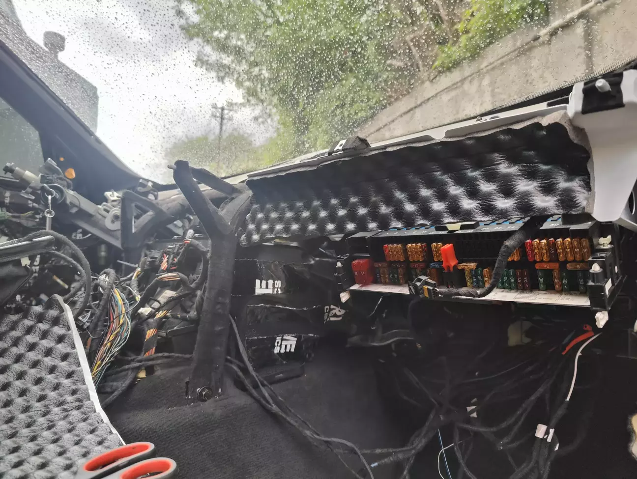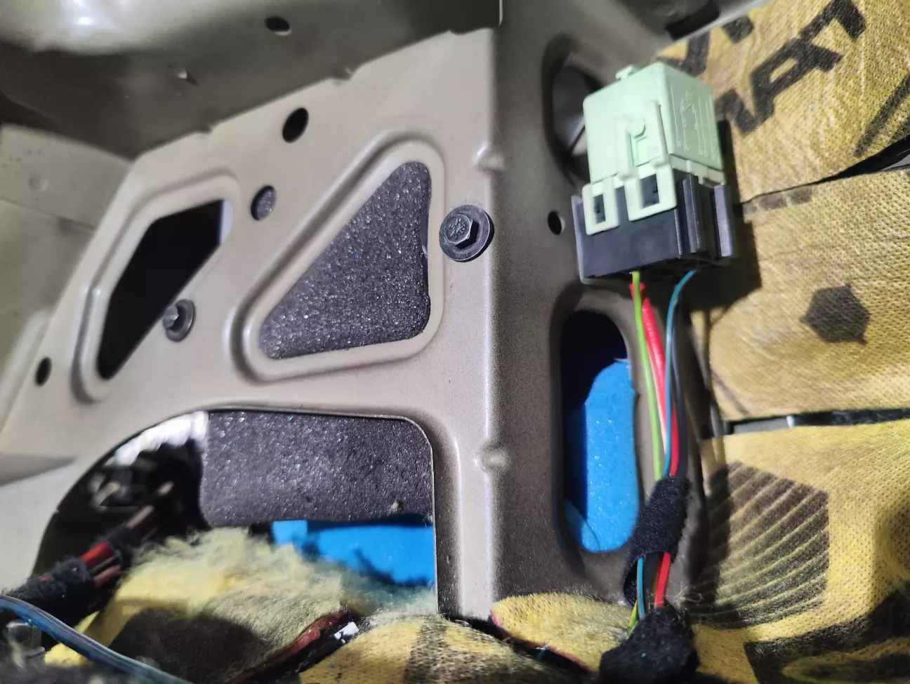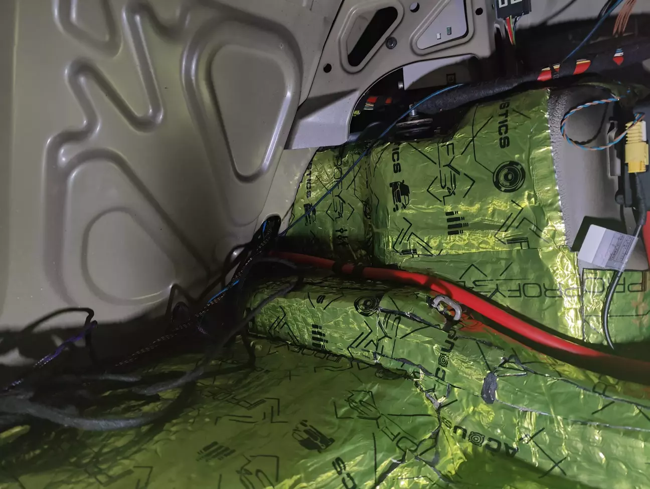 На арках вийнятково 4 мм, як і у всій лівій частині авто – там буде сабвуфер. У мене тут було багато проводки, телефон, навігація тощо – все демонтував, ним ніхто не користується і не буде. Все, що залишилось щільно замотав у м’який поролоновий матеріал, розмістив у ніші під блоки та додав туди синій ізолюючий блок, щоб уникнути будь яких можливих звуків. Блоки PDC, система аварійного відкривання лючка та інші елементи також були оброблені. Тепер вони встановлені максимально щільно.