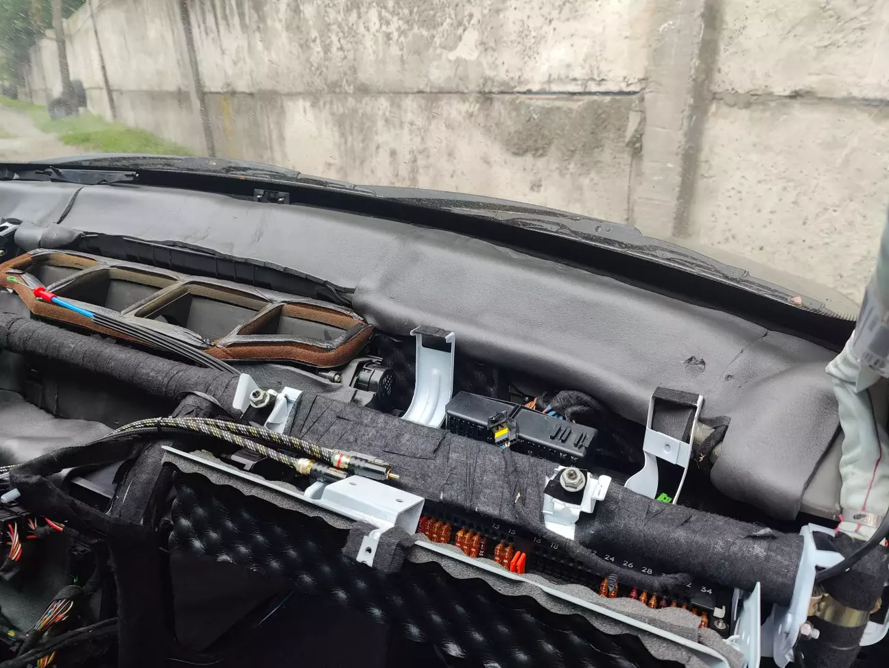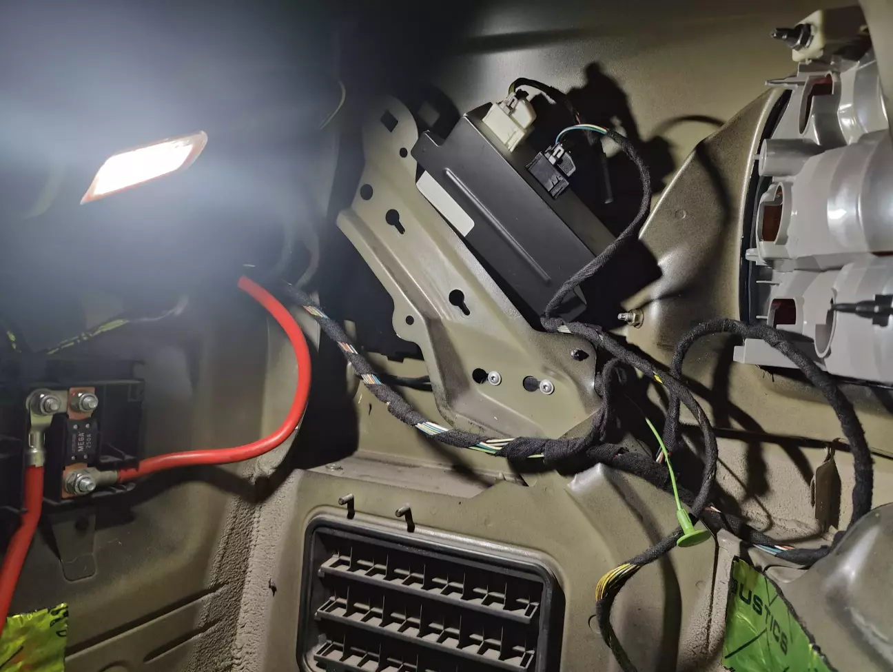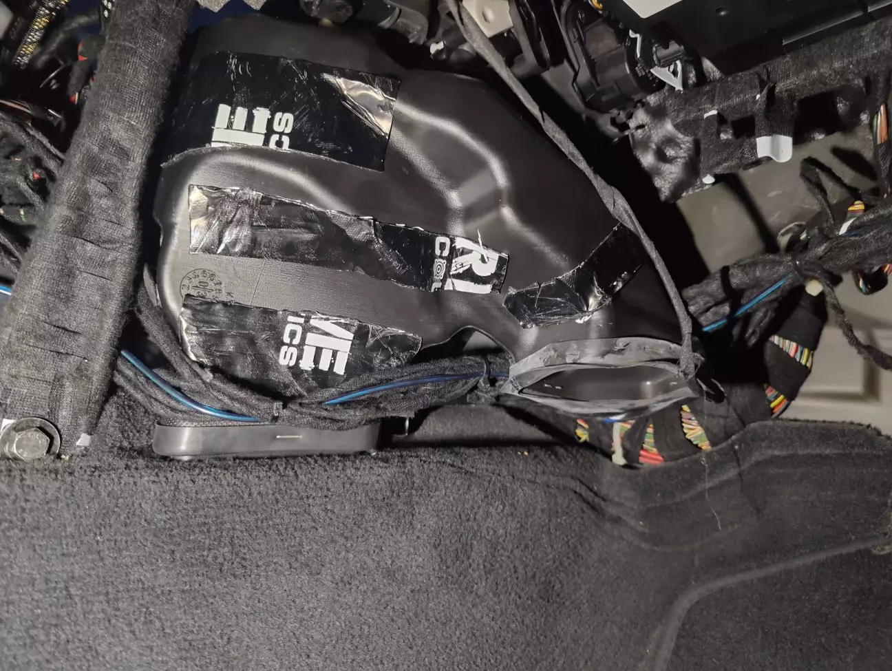 На арках вийнятково 4 мм, як і у всій лівій частині авто – там буде сабвуфер. У мене тут було багато проводки, телефон, навігація тощо – все демонтував, ним ніхто не користується і не буде. Все, що залишилось щільно замотав у м’який поролоновий матеріал, розмістив у ніші під блоки та додав туди синій ізолюючий блок, щоб уникнути будь яких можливих звуків. Блоки PDC, система аварійного відкривання лючка та інші елементи також були оброблені. Тепер вони встановлені максимально щільно.