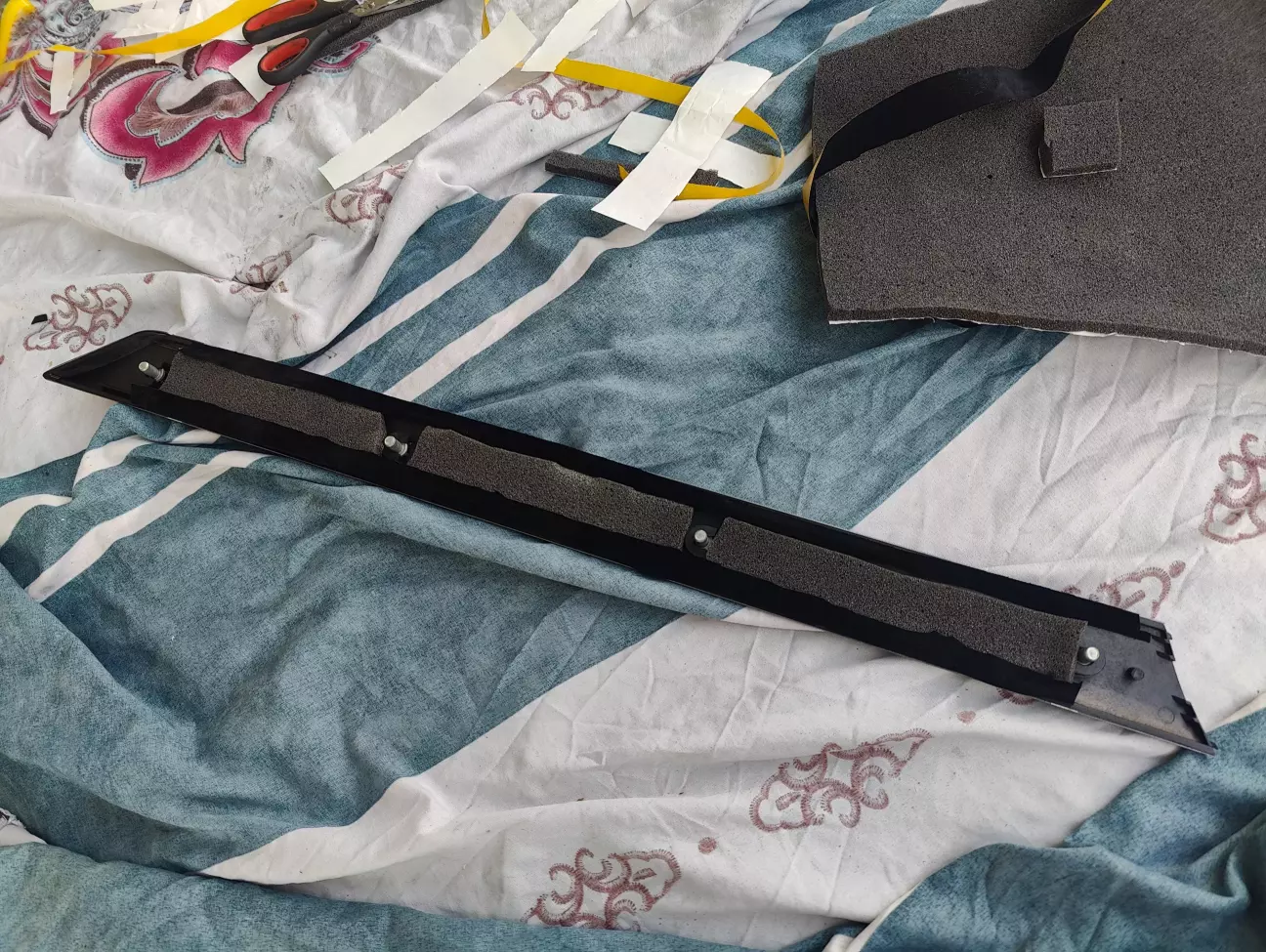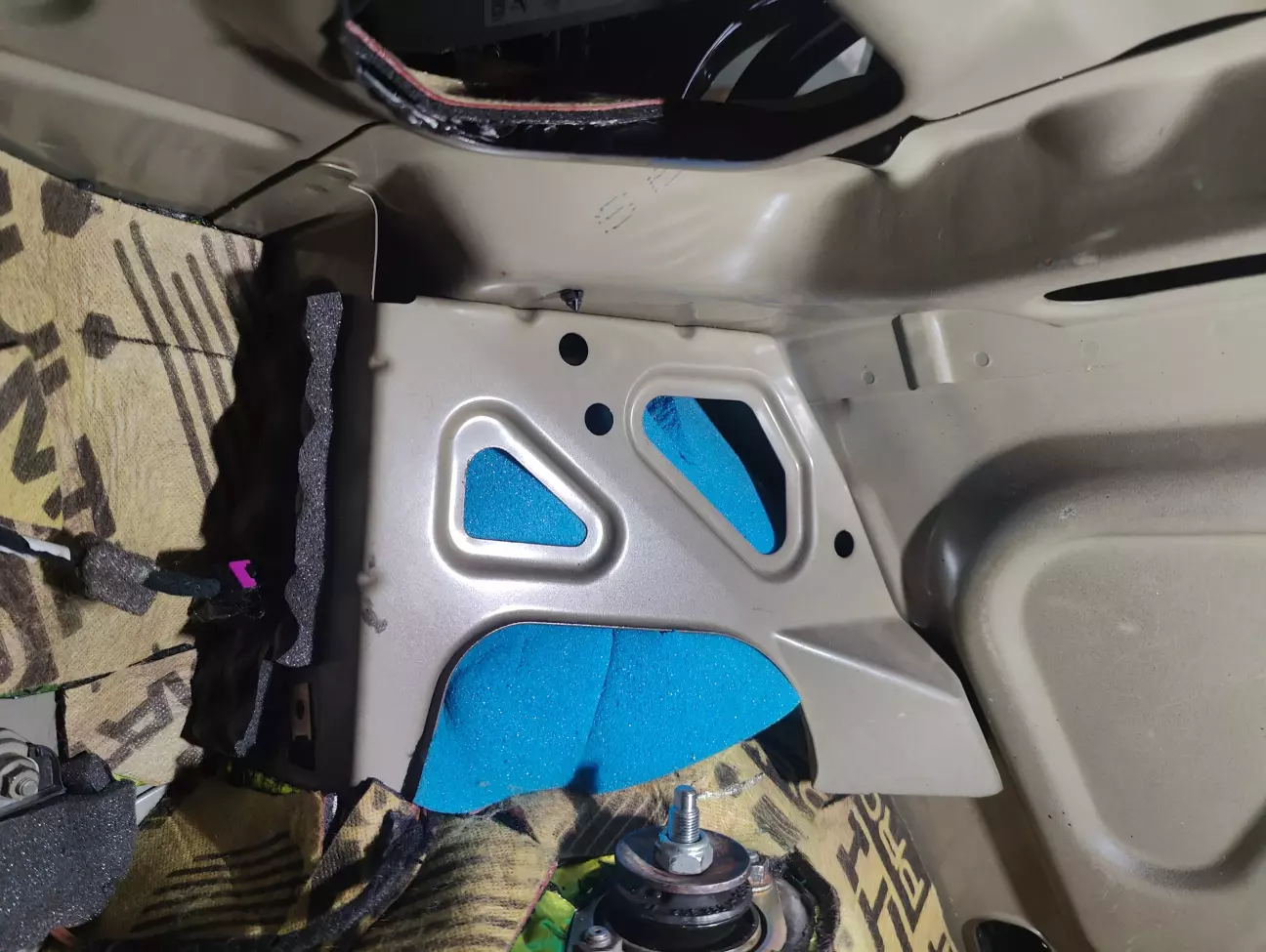 На стійки ззаду поклеїв лише шумку. Сенс тут в тому, щоб прибрати зазор між металом та пластиком.