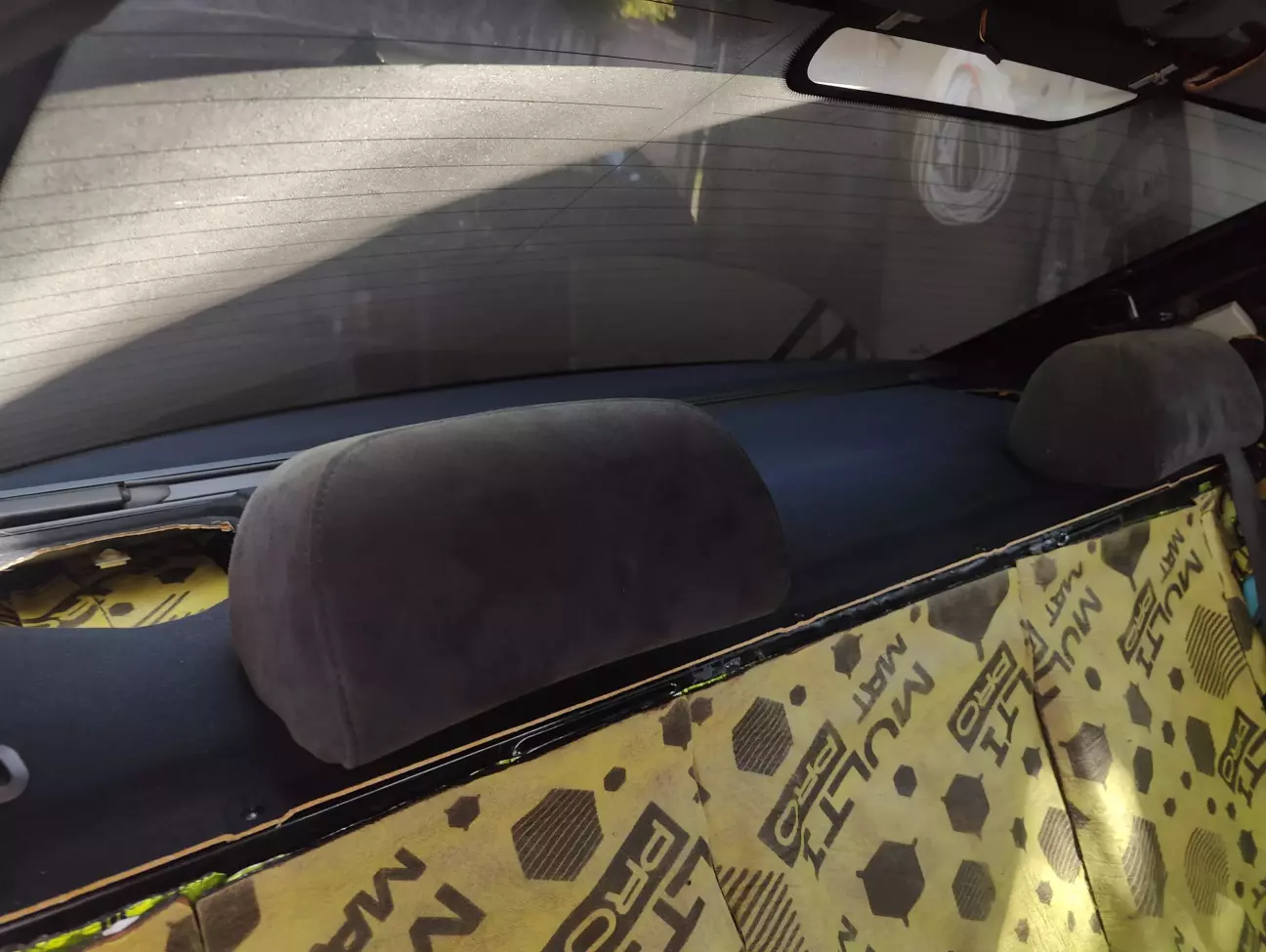 Тут як бачите багато заводських отворів, їх вирішив залишити. В цій машині є система вентиляції повітря в салоні, нехай вона буде далі в незмінному вигляді. Враховуючи дуже товстий матеріал по заводу, ставити полицю стало значно легше після подібної обробки, разом зі шторкою. Пластик в кутку теж обробив антискрипом та шумкою. Все стало дуже плотно.