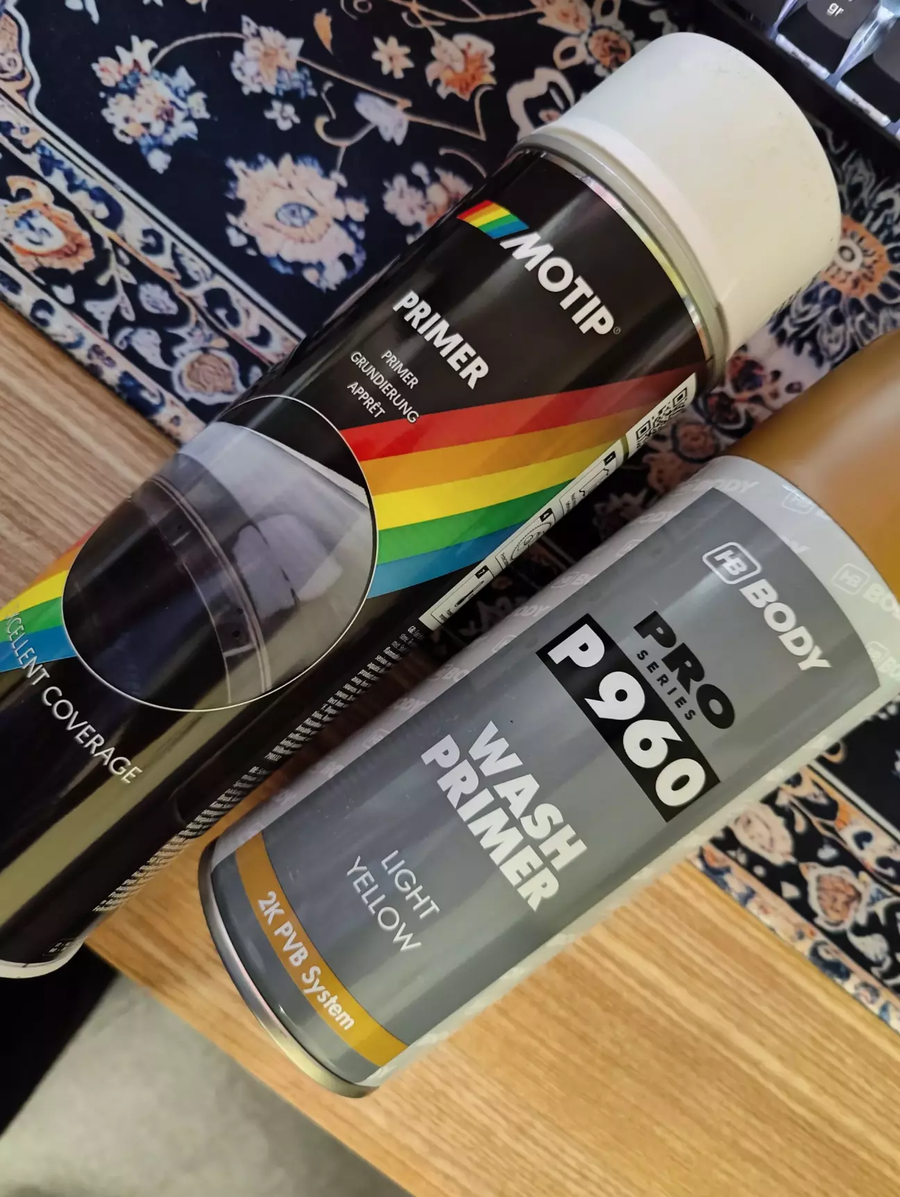 По фарбі: кислотний грунт спочатку, далі акриловий (хоч насправді краще було взяти епоксидний, бо акрил занадто пасивний, але уже було пізно коли згадав), далі фарба і далі матовий лак. Вийшло як на мене, непогано, в балконних то умовах.