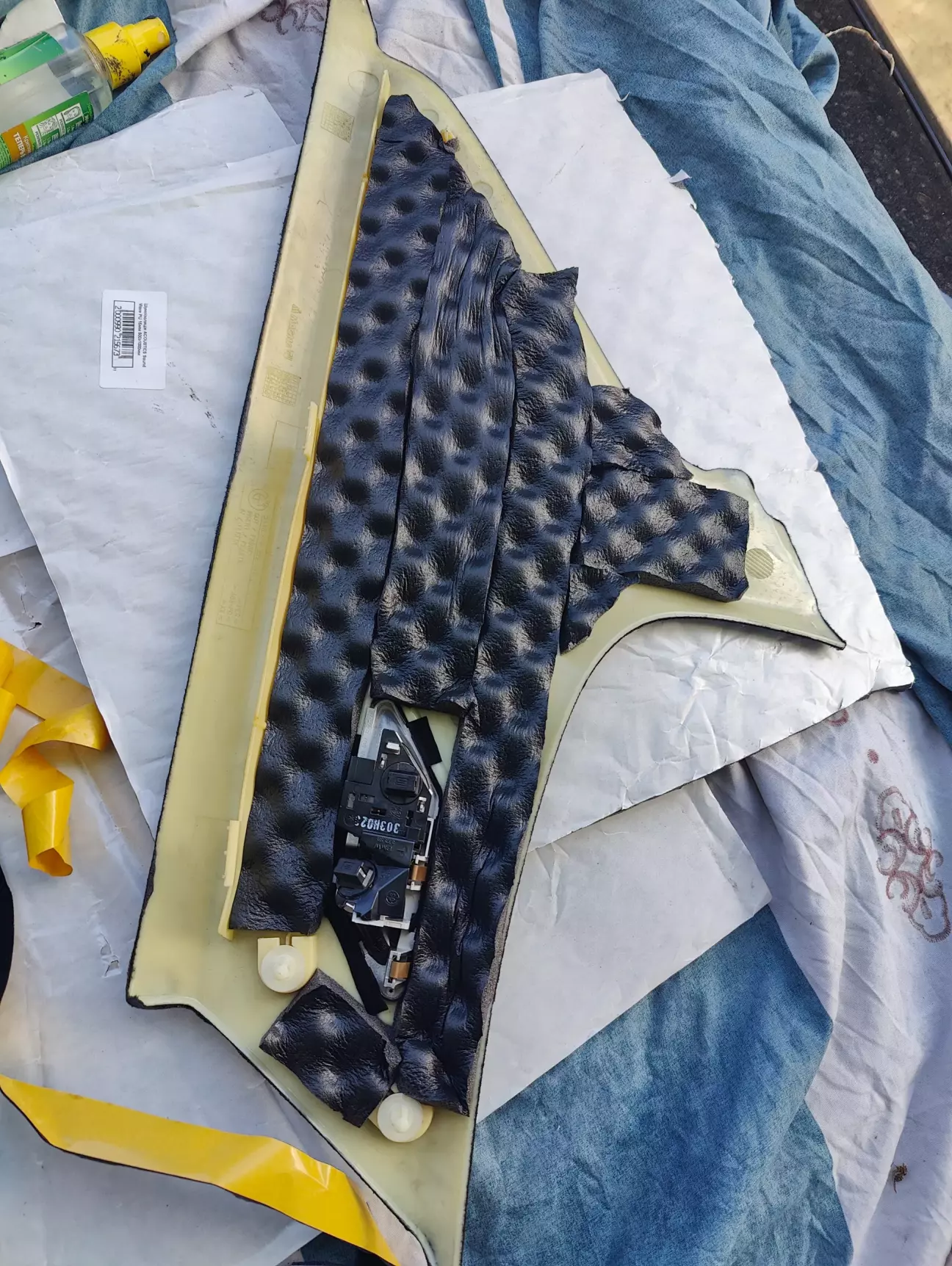 На декількох стійках почала відклеюватись тканина про краями, купив клей для того щоб виправити - Permatex Body Shop Heavy Duty Headliner & Carpet Adhesive 27828. Вийшло чудово з ним. Тримається дуже міцно як на мене. З тих робіт пройшло декілька місяців, нині все так само як і після поклейки.
