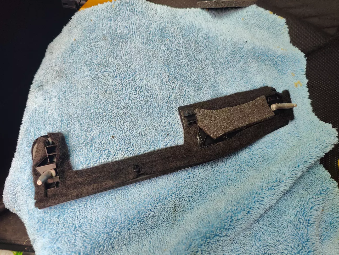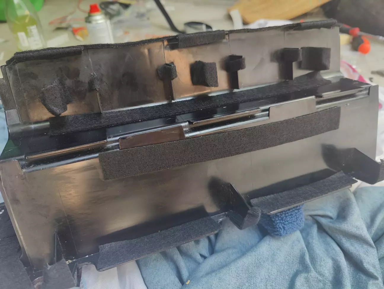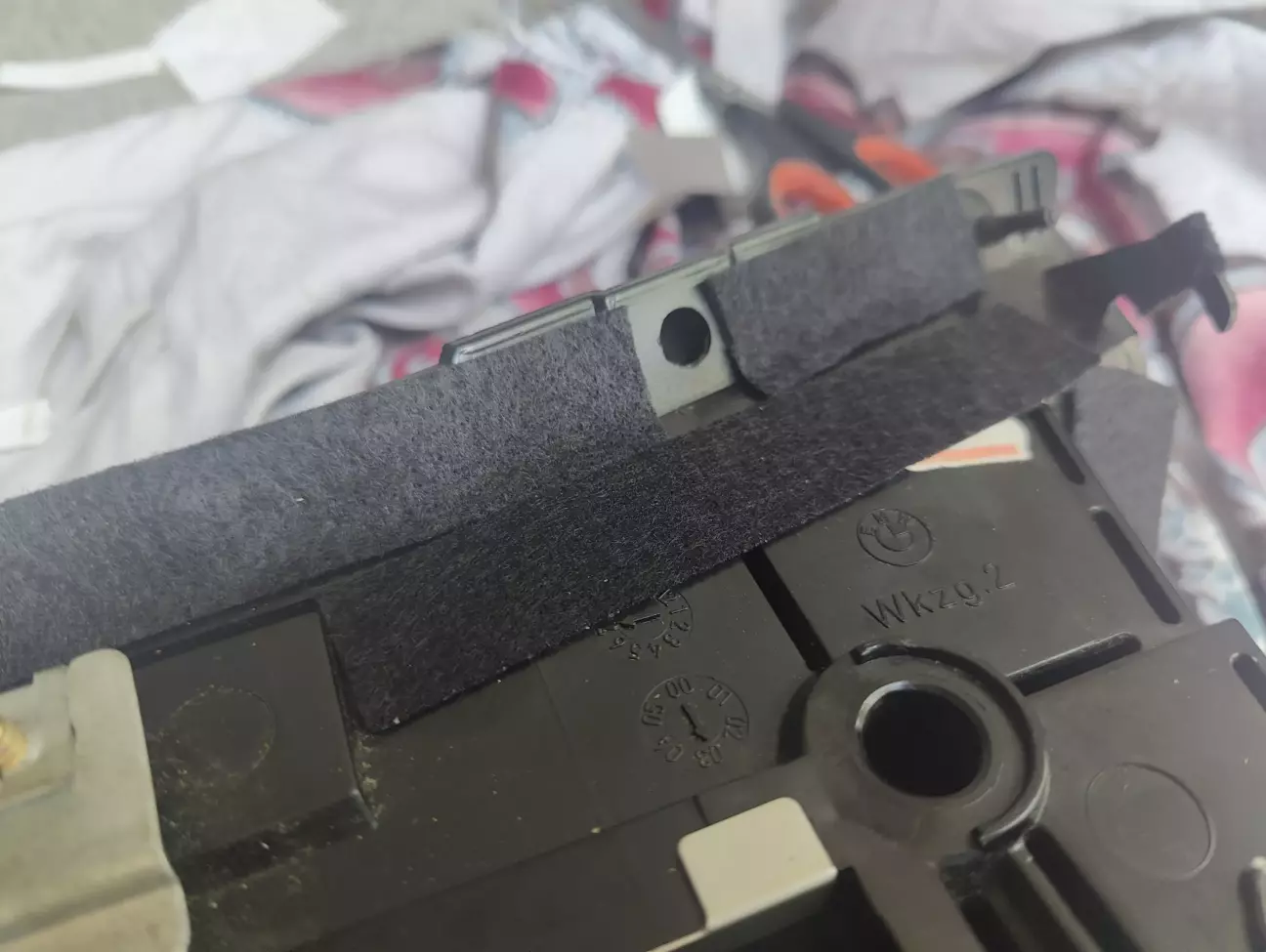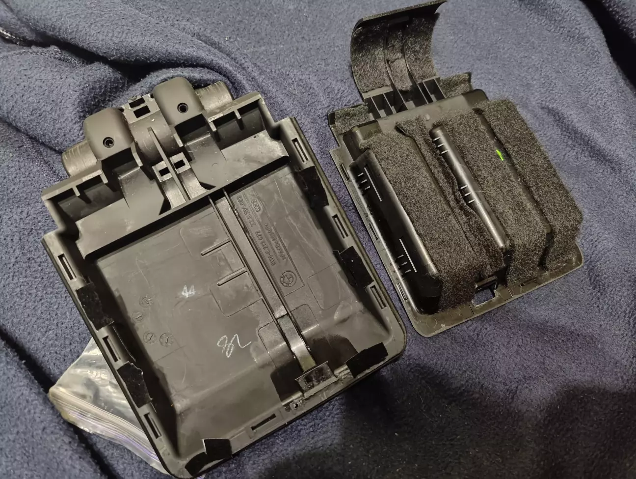 Ця штука хрустить у всіх Е46, в яких я був. Така конструкція. Розібрав повністю, обробив. Тепер краще, але він сам по собі треться, верхня панель об нижню – обклеїти там не вийде бо перестане закриватись легко, я тестував. Прийдеться з цим жити. Але благо уже не так як було по заводу, результат досягнений десь на 75%.