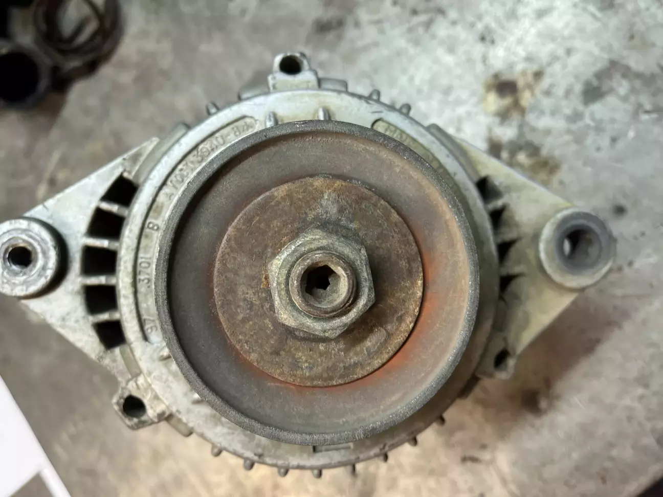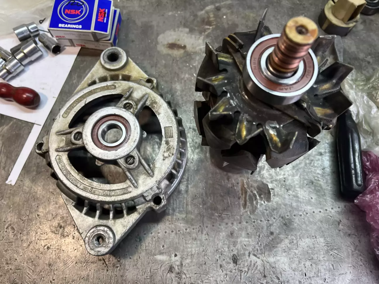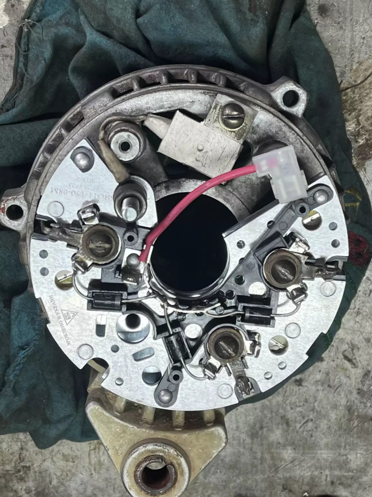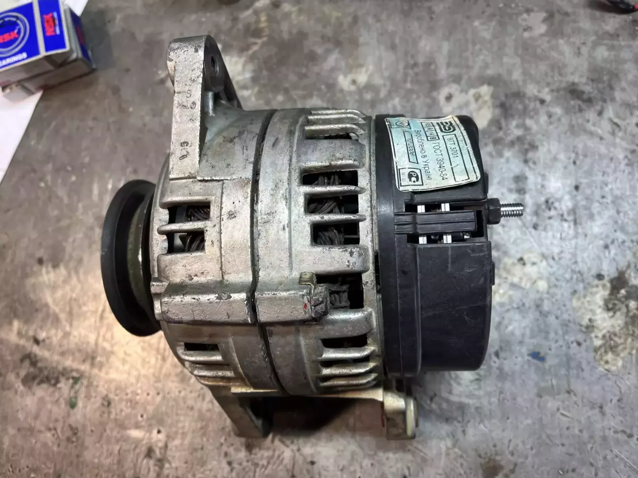 Передісторія така - коли купив машину,не було збудження на генераторі,поки не газнеш до 3000 - 3500 об/хв , не було зарядки та світилася лампа зарядки червоним,після того як газнув ,лампа гасла та зʼявлялася зарядка. Звісно,це не діло ,помоніторив цю тему ,знайшов інформацію що можна обдурити цю хворобу,підкинув окрему лампочку безпосередньо на генератор ,завдяки якій з’явиться збудження а лампа у панелі приладів буде відігравати суто інформативну роль . Сказано ,зроблено (на фото видно додаткову лампу ). Друга проблема була у тому що зарядка не піднімалася більше ніж 13.6 - 13.7 В . Цю проблему вирішив підкинувши додатковий діод,після цього зарядка піднялася до 14.3 - 14.5 В ,але при включенні споживачів ,таких як пічка ,головне світло ,стопи ,обігрів заднього скла ,напруга відчутно просідала ,хоча і не критично ,нижче 13.5 не падала (це з додатковим діодом ). Їздив так і особливо не парився ,єдине про що постійно думав ,то про те що їжджу без задньої захисної кришки генератора ,бо усі ті дроти що я там накрутив не давали їй сісти на своє місце ,дуже вже там все компактно. І ось нещодавно почув з під капота сторонній шум при працюючому двигуні,огляд виявив що звук йде з генератора ,почав шелестіти ,тому вирішив зробити ревізію генератору . Ну а якщо вже повністю знімати генератор,то вже можна спробувати вирішити проблему з зарядкою та збудженням. Купив новий діодний міст від ВТН ,два підшипника NSK (маде ін джапан) ,дочекався більш-менш хорошої походи і за діло..