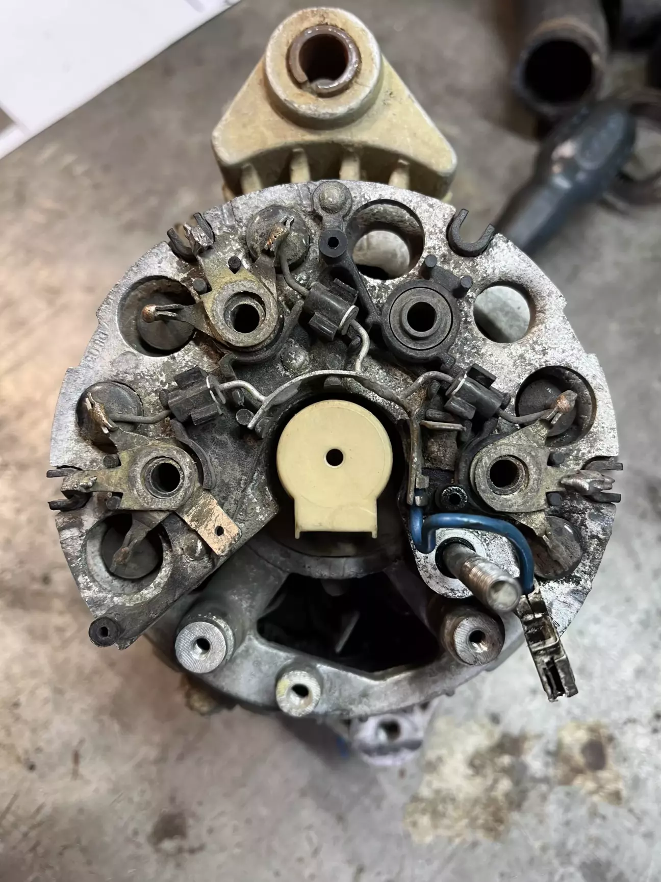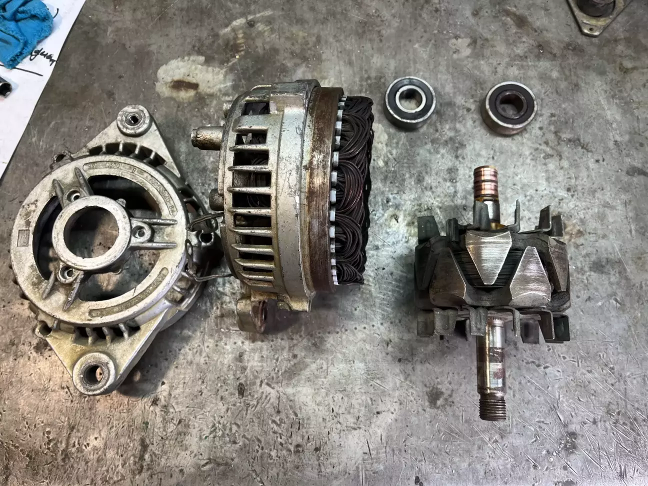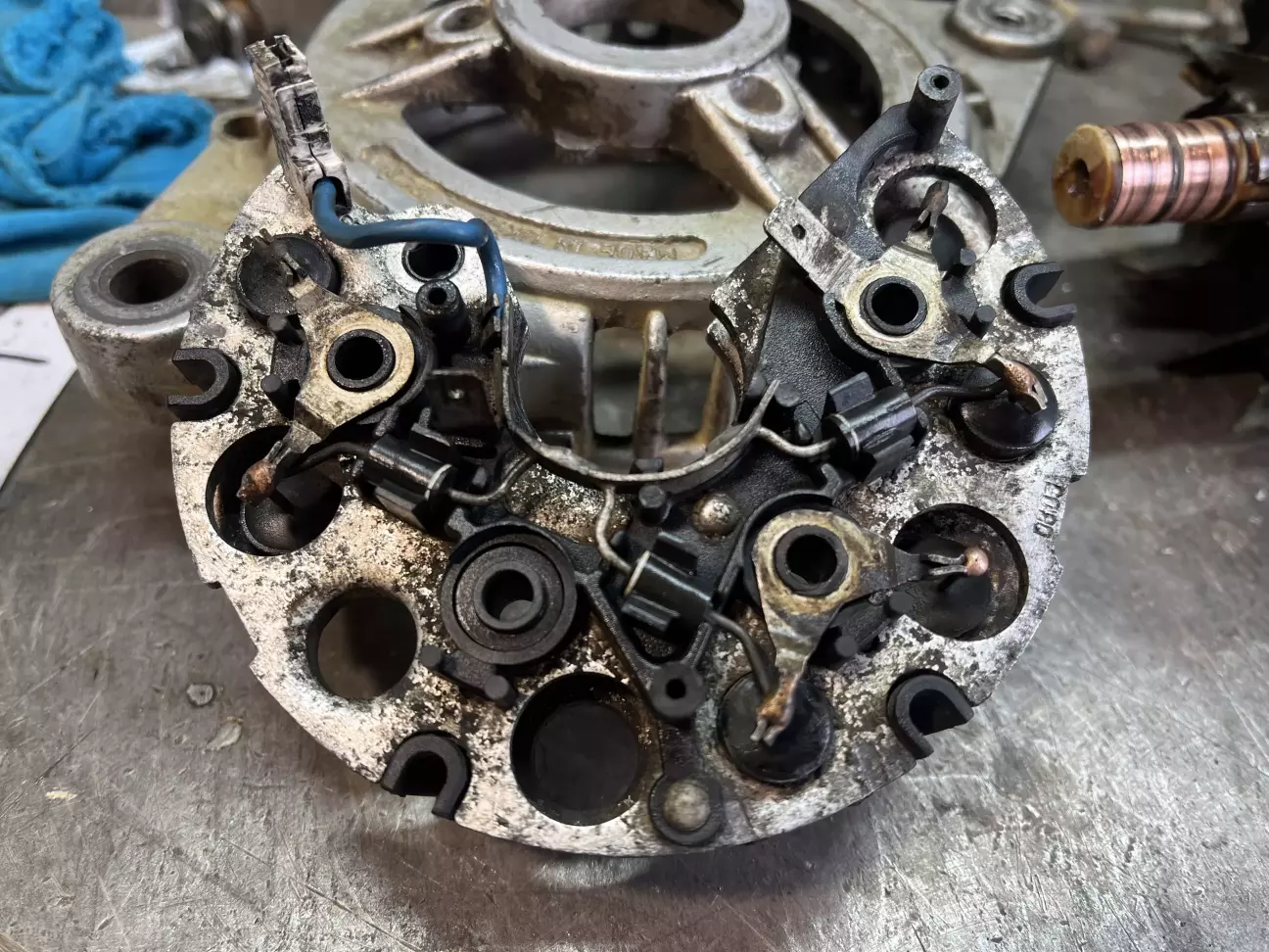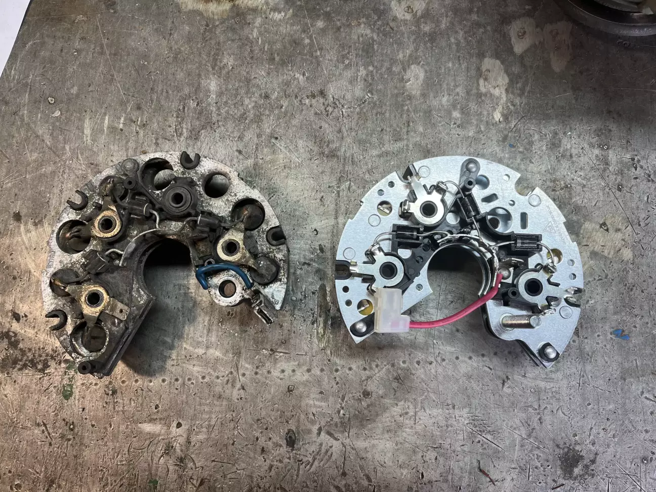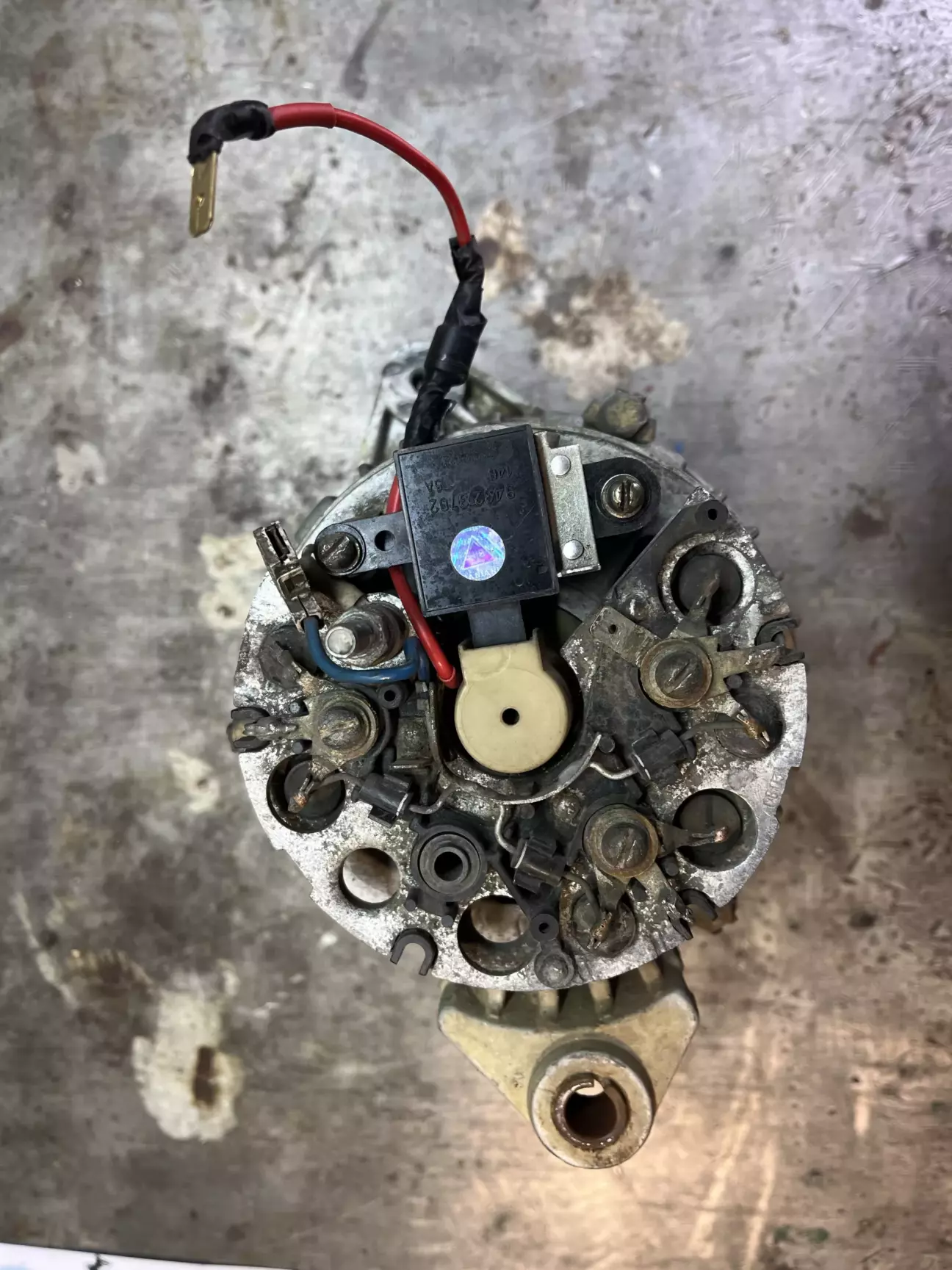 Передісторія така - коли купив машину,не було збудження на генераторі,поки не газнеш до 3000 - 3500 об/хв , не було зарядки та світилася лампа зарядки червоним,після того як газнув ,лампа гасла та зʼявлялася зарядка. Звісно,це не діло ,помоніторив цю тему ,знайшов інформацію що можна обдурити цю хворобу,підкинув окрему лампочку безпосередньо на генератор ,завдяки якій з’явиться збудження а лампа у панелі приладів буде відігравати суто інформативну роль . Сказано ,зроблено (на фото видно додаткову лампу ). Друга проблема була у тому що зарядка не піднімалася більше ніж 13.6 - 13.7 В . Цю проблему вирішив підкинувши додатковий діод,після цього зарядка піднялася до 14.3 - 14.5 В ,але при включенні споживачів ,таких як пічка ,головне світло ,стопи ,обігрів заднього скла ,напруга відчутно просідала ,хоча і не критично ,нижче 13.5 не падала (це з додатковим діодом ). Їздив так і особливо не парився ,єдине про що постійно думав ,то про те що їжджу без задньої захисної кришки генератора ,бо усі ті дроти що я там накрутив не давали їй сісти на своє місце ,дуже вже там все компактно. І ось нещодавно почув з під капота сторонній шум при працюючому двигуні,огляд виявив що звук йде з генератора ,почав шелестіти ,тому вирішив зробити ревізію генератору . Ну а якщо вже повністю знімати генератор,то вже можна спробувати вирішити проблему з зарядкою та збудженням. Купив новий діодний міст від ВТН ,два підшипника NSK (маде ін джапан) ,дочекався більш-менш хорошої походи і за діло..