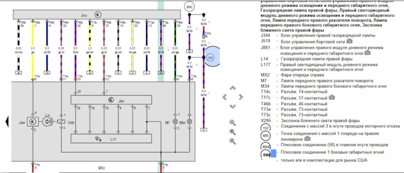 Согласно схемы нам необходимо распиновать T14b/8 на левой фаре и T14c/8 на правой фаре.