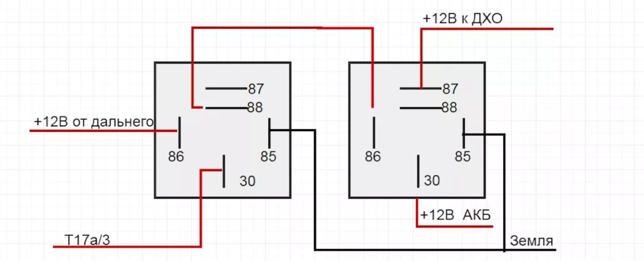 В разговоре с Mr-Sergio89 пришлая идея также реализовать эффект стробоскопа при моргании дальним светом. Поэтому первичная схема потерпела изменения. Было задействовано еще одно 5-ти контактное реле.